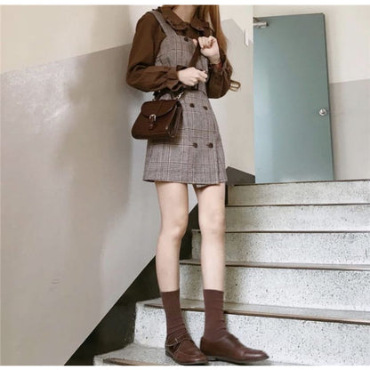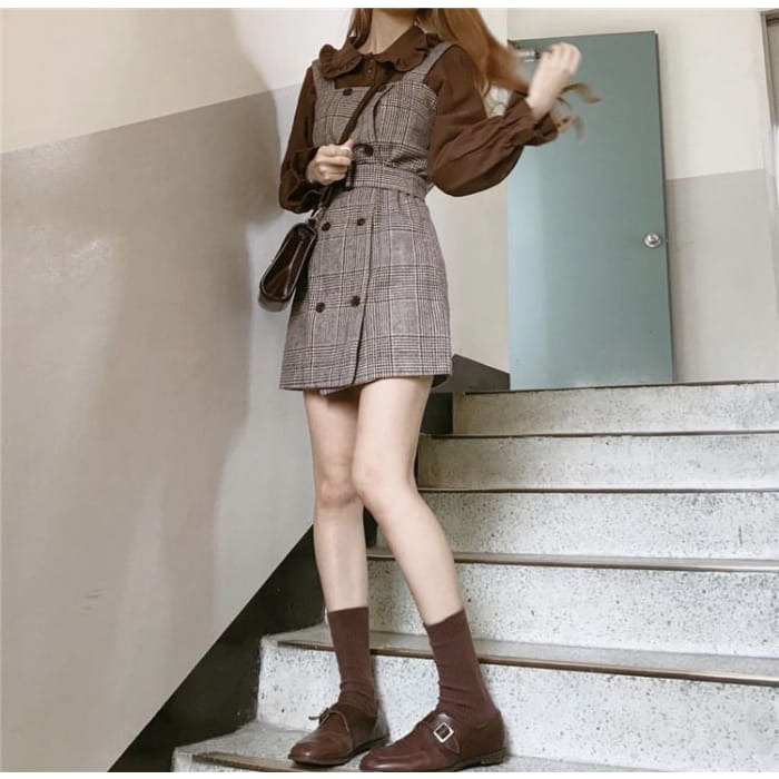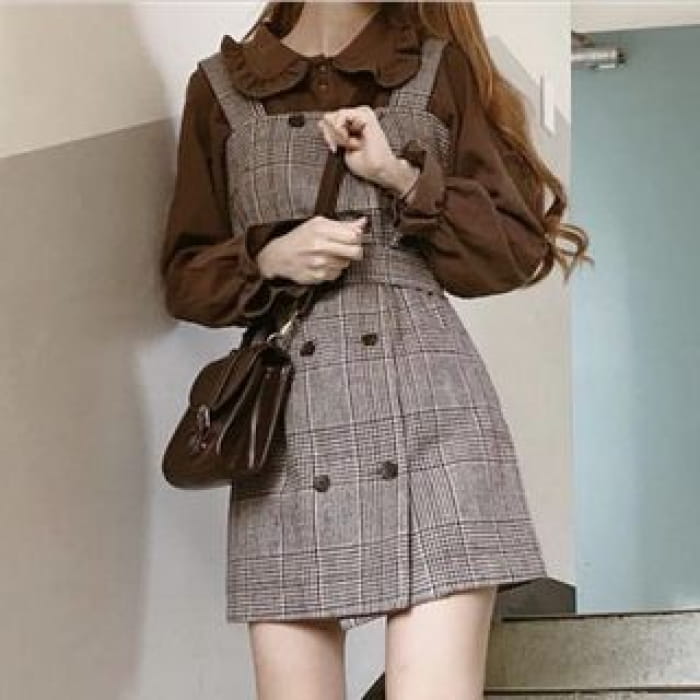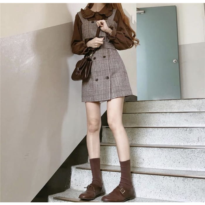 Langärmlige Bluse mit Rüschenkragen / Zweireihiges, kariertes Overallkleid