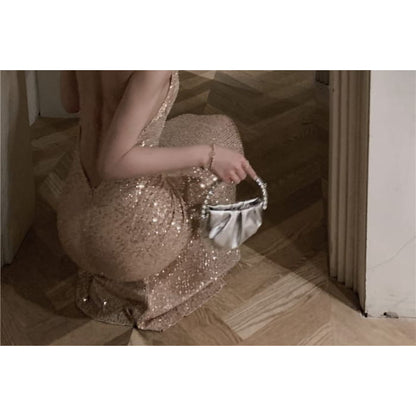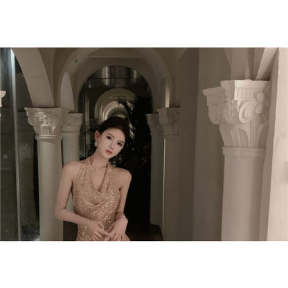 Neckholder-Abendkleid im Meerjungfrauen-Stil mit Wasserfallausschnitt und Pailletten