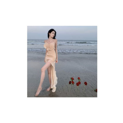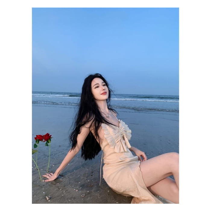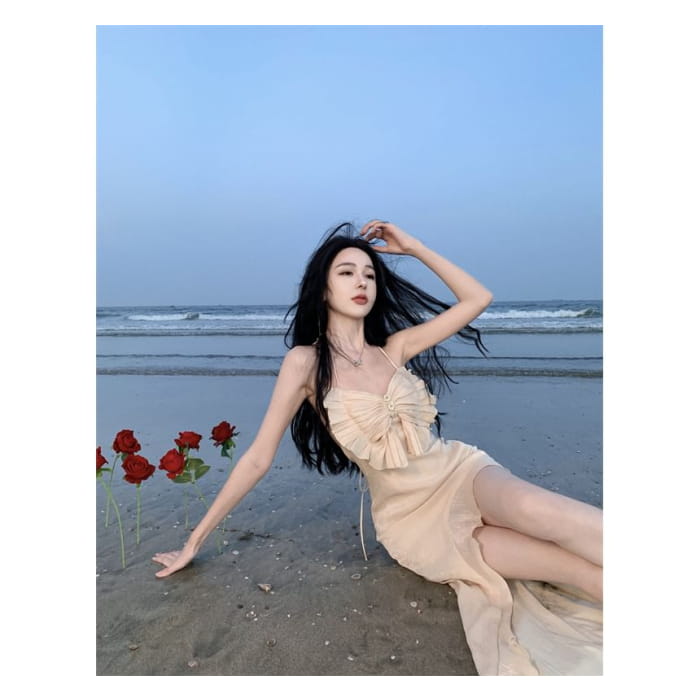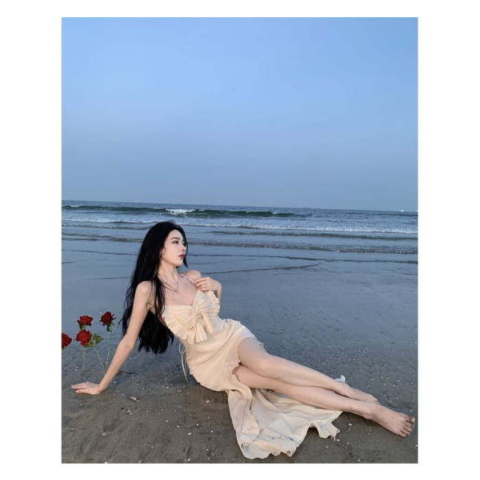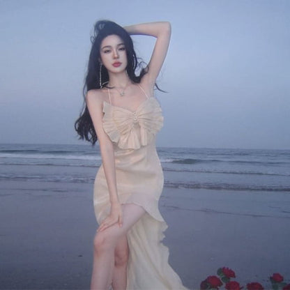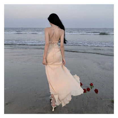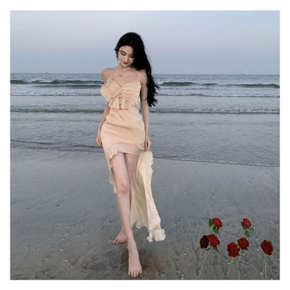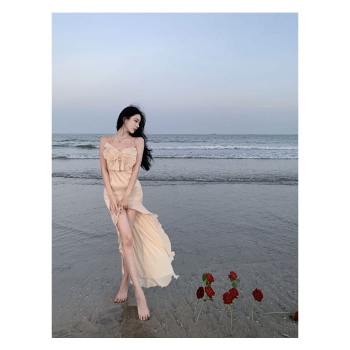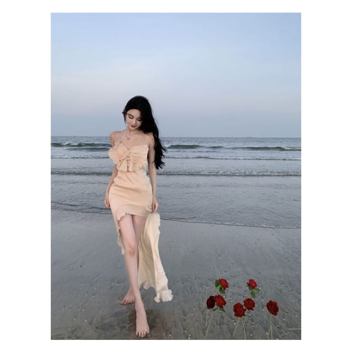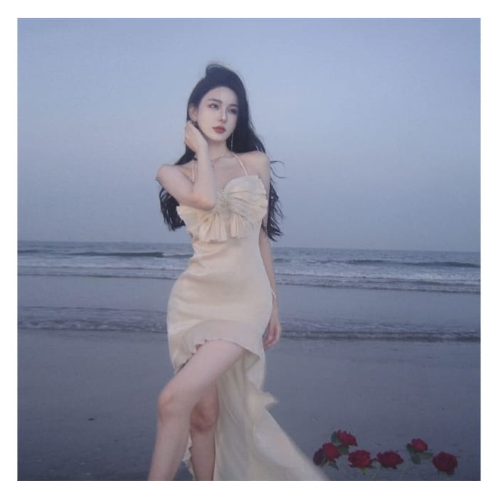 Halter-Neck Plain Bow High Low Mermaid Dress