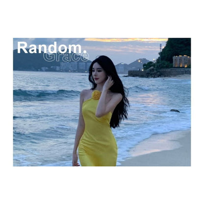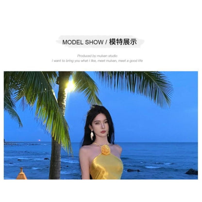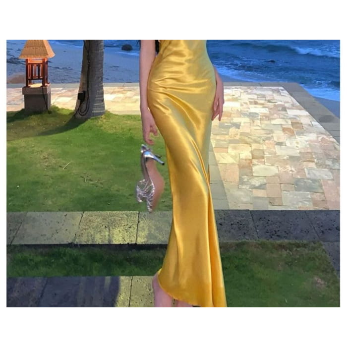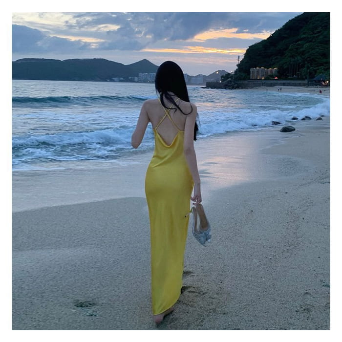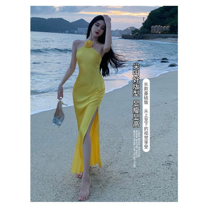 Halter-Neck Plain Floral Slit Midi Bodycon Dress