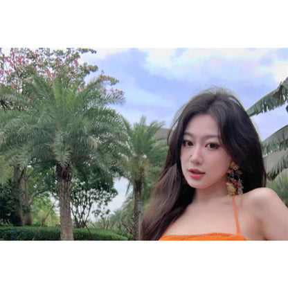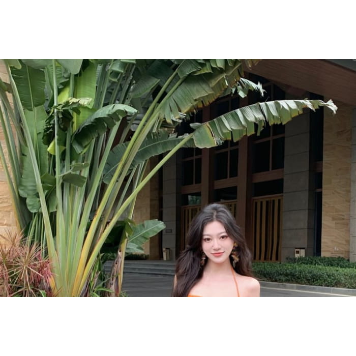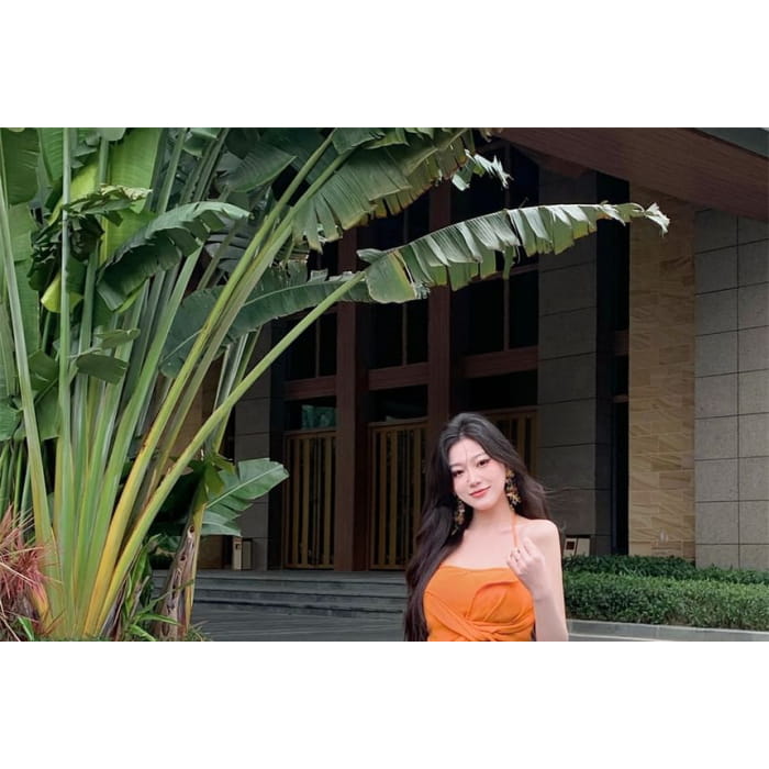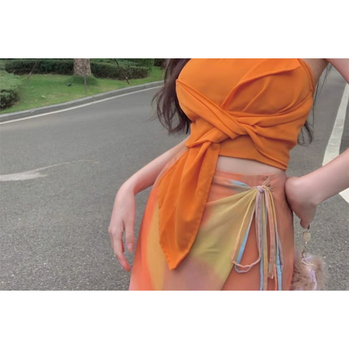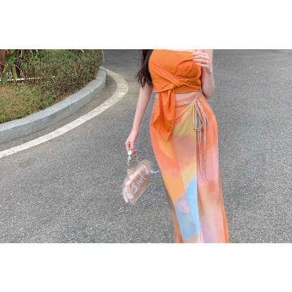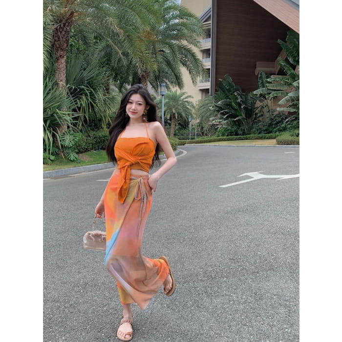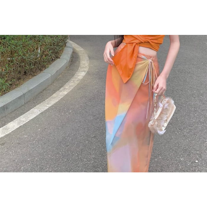 Neckholder-Oberteil mit schlichtem Bindegürtel und offenem Rücken, bauchfreies Oberteil / Maxirock mit hoher Taille und Batikmuster und seitlicher Bindebandpartie / Set