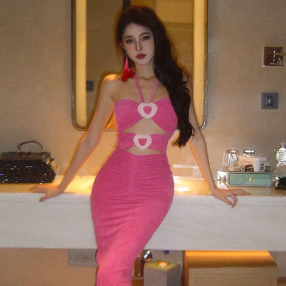Neckholder-Maxikleid mit zweifarbigem Cut-out, Herz-Ausschnitt, Schnalle, Rüschen, offenem Rücken und Schlitz, figurbetontes Kleid