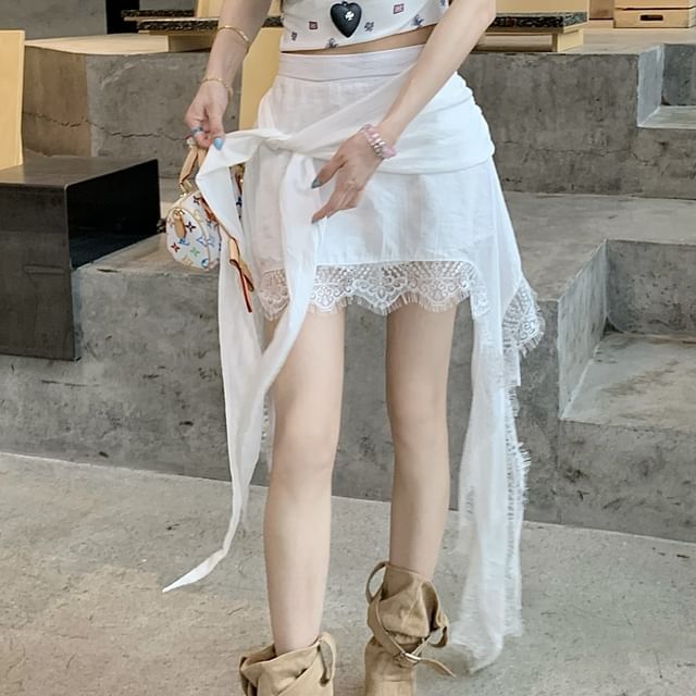High Asymmetrical Wrap Plain Trim Lace Waist Skort