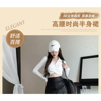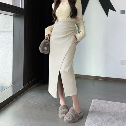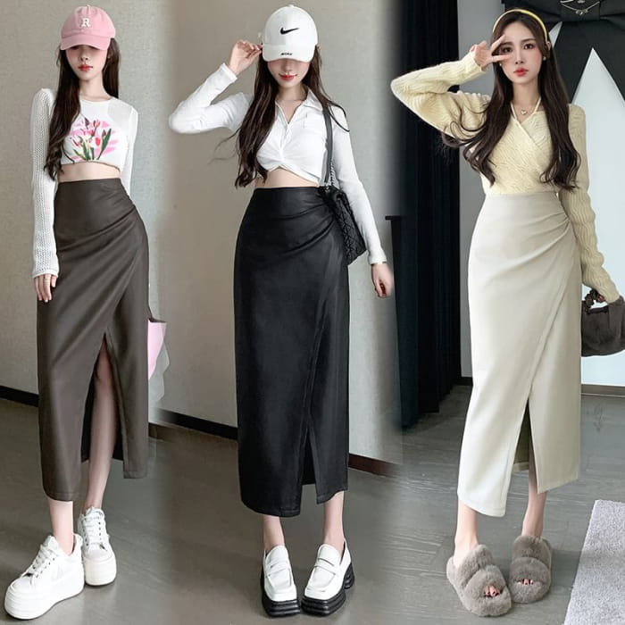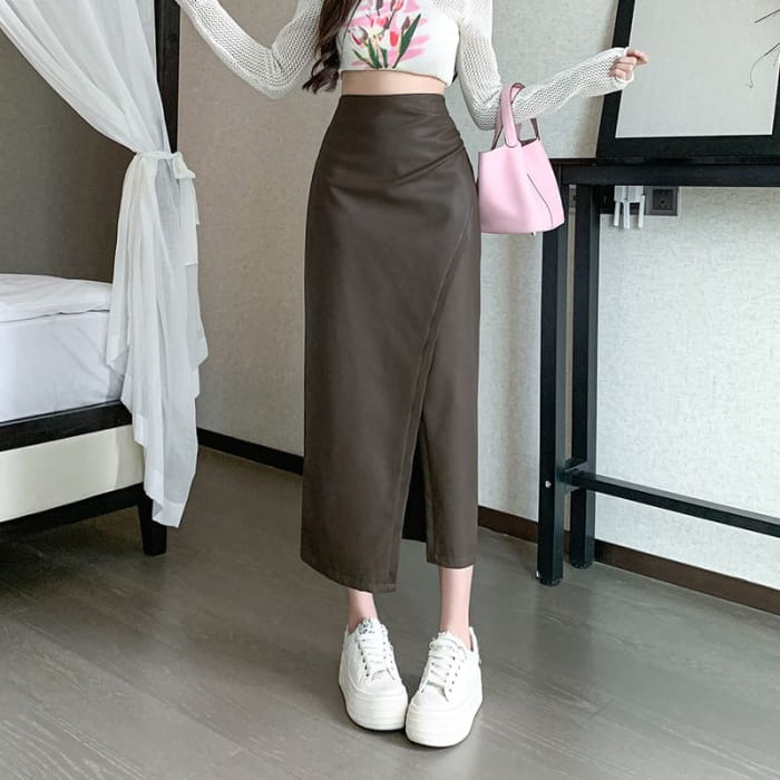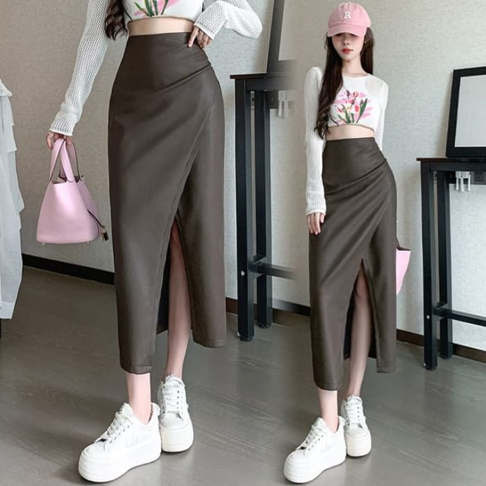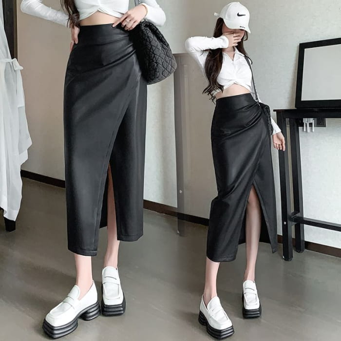 High Rise Plain Faux Leather Slit Midi Pencil Skirt