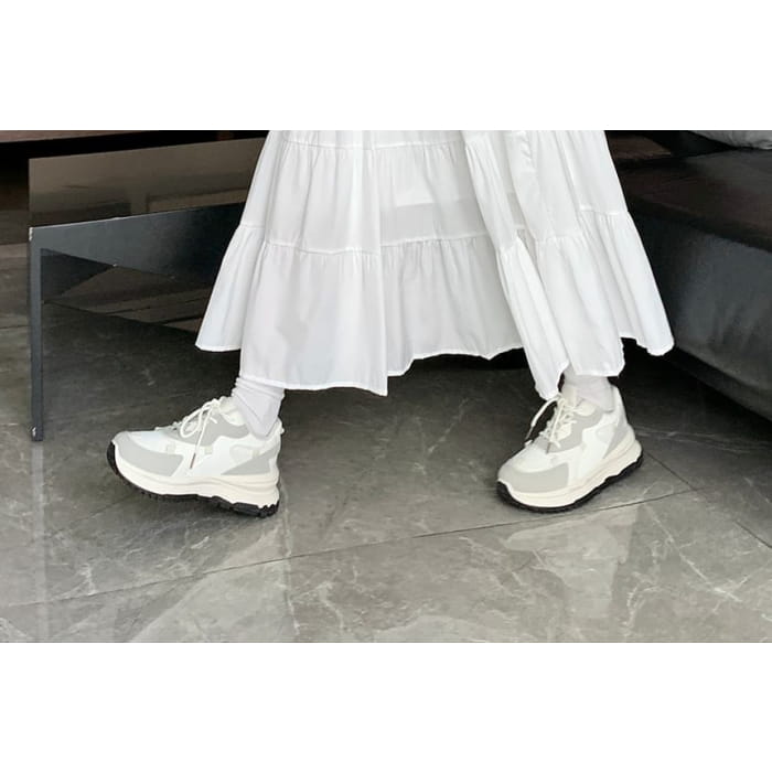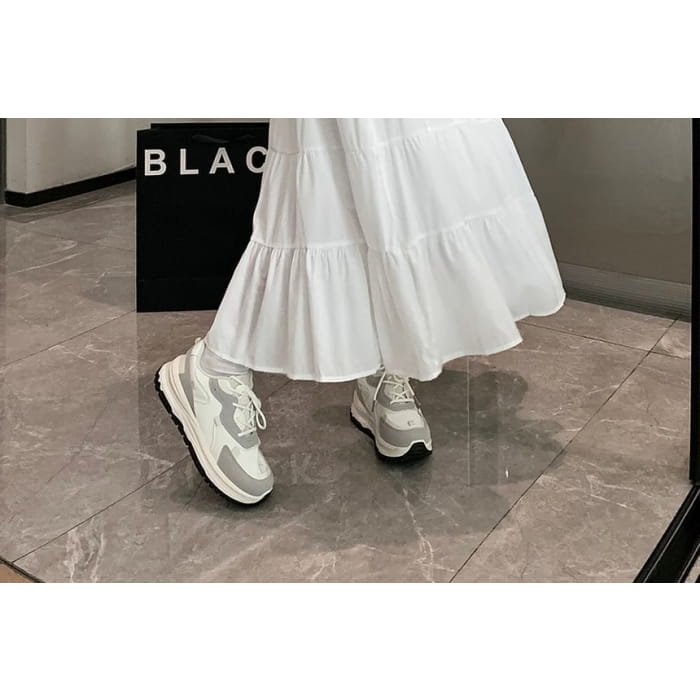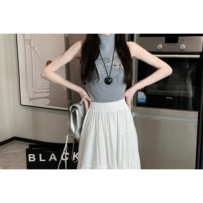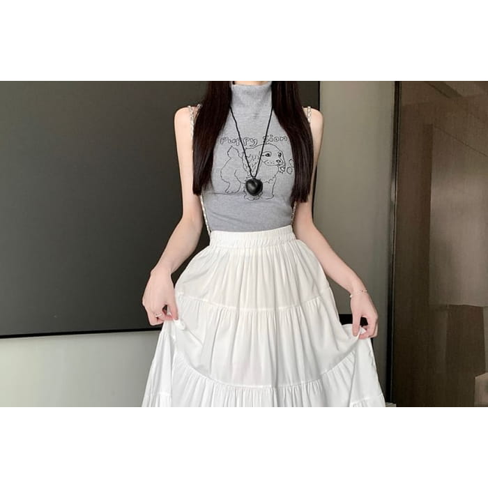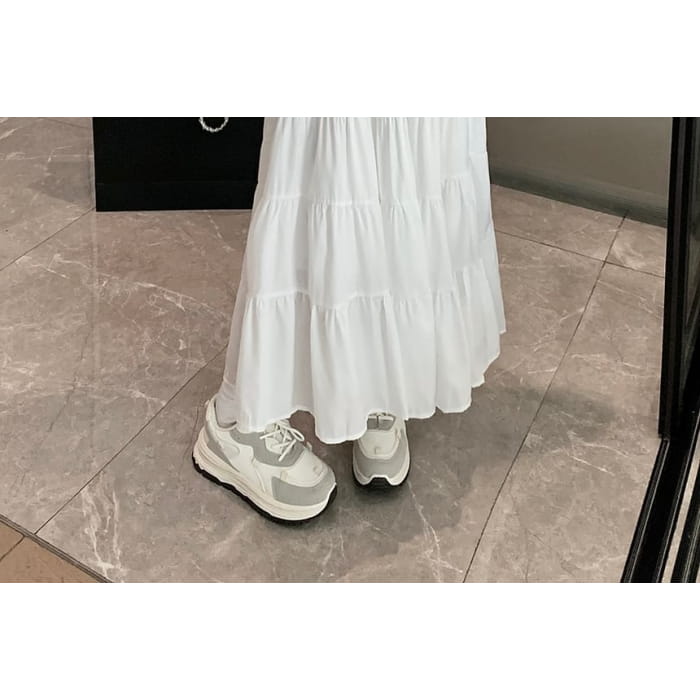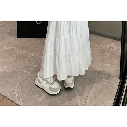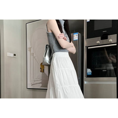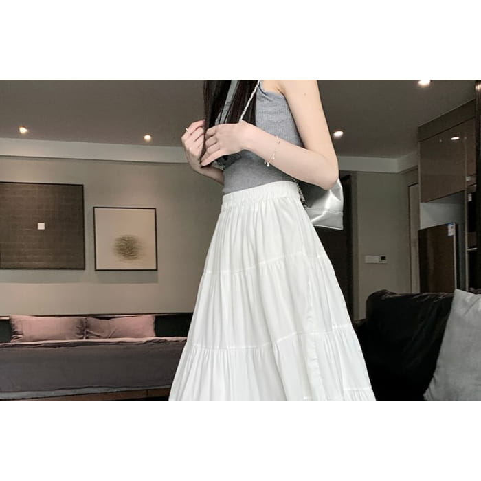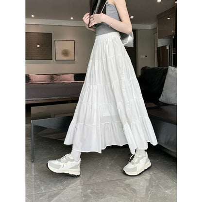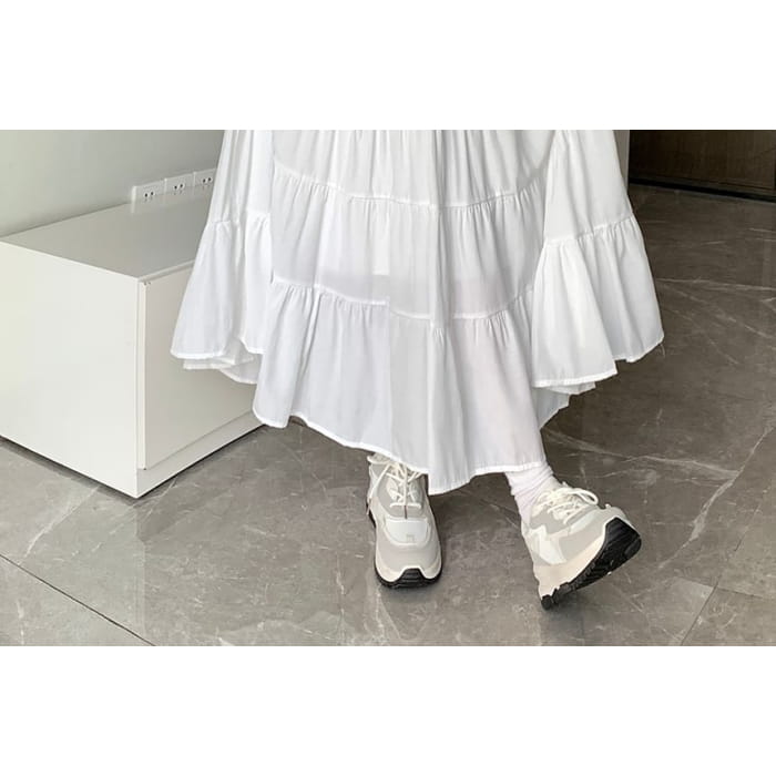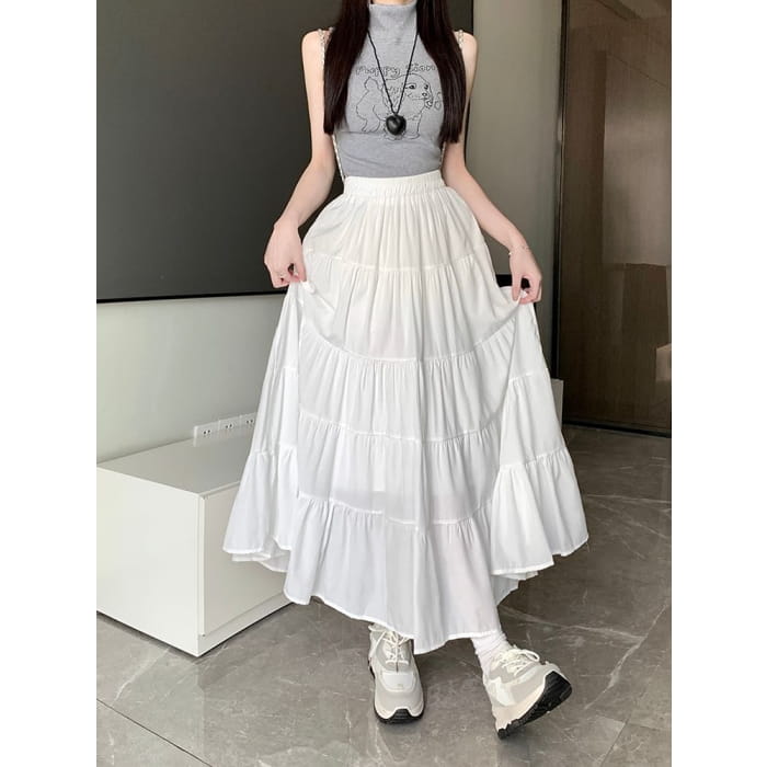 Hochgeschnittener, schlichter Maxirock in A-Linie mit Rüschen