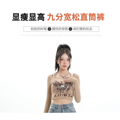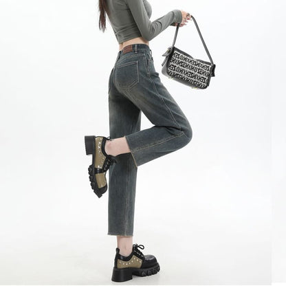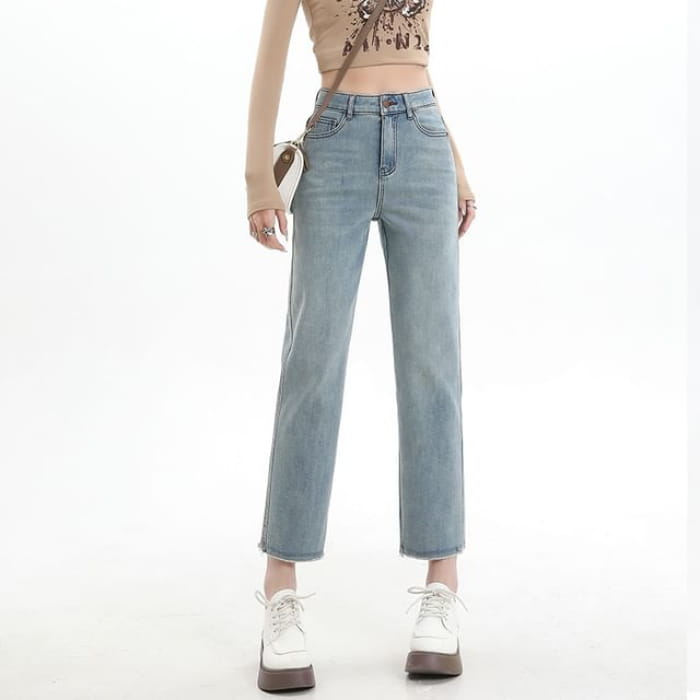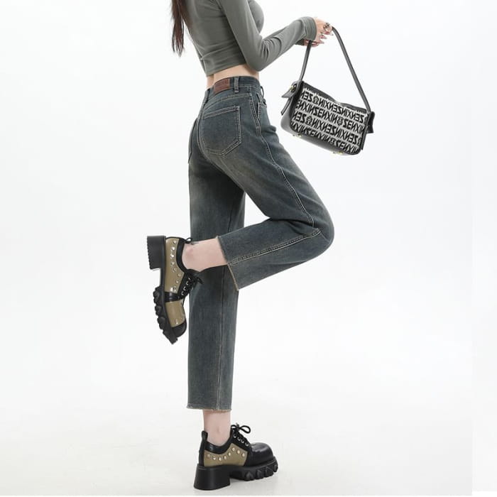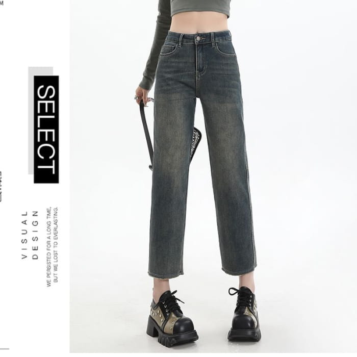 Verwaschene, verkürzte Jeans mit geradem Bein und hoher Taille