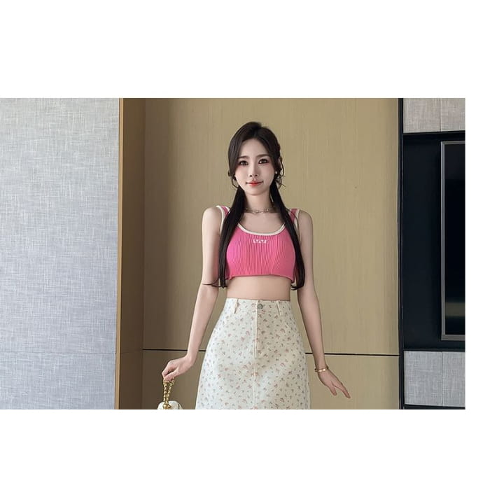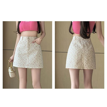 Mini-Bleistiftrock aus Denim mit Blumenmuster und hoher Taille
