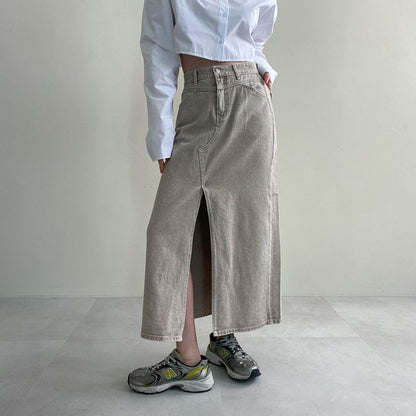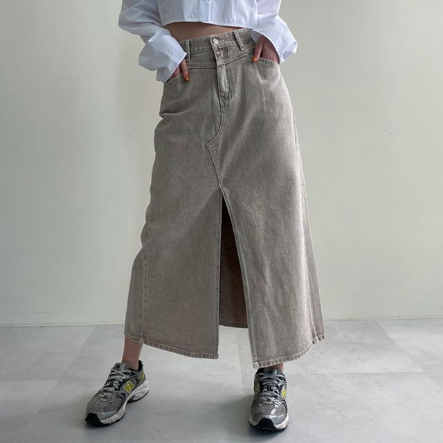 High Waist Front-Slit Denim Maxi A-Line Skirt