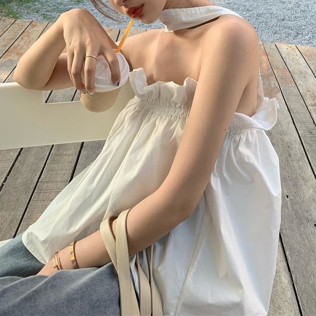 Plain Ruffled Open Keyhole Back Balloon Camisole Top