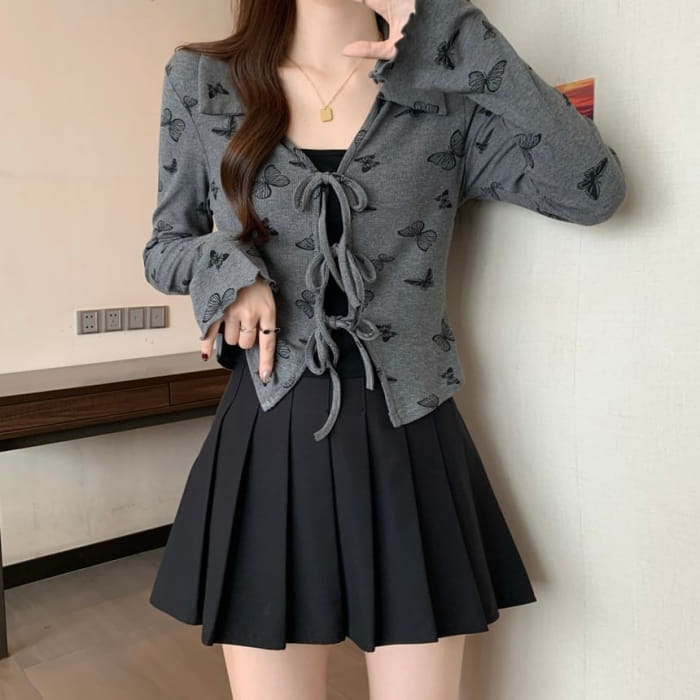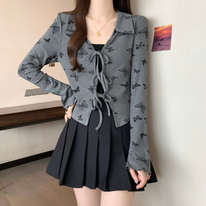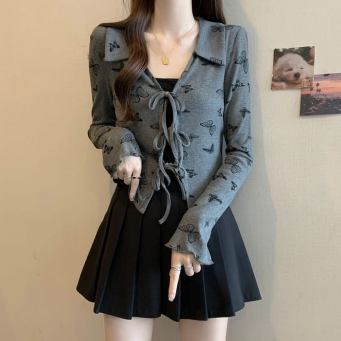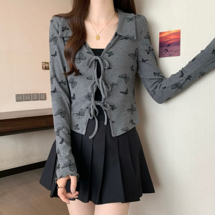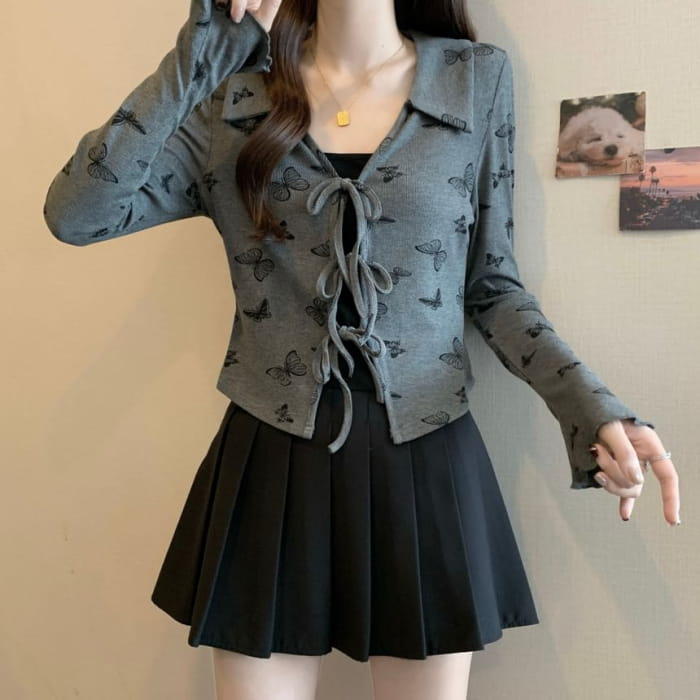 Langärmliges, kurzes, zweiteiliges Oberteil mit V-Ausschnitt und Schmetterlings-Print