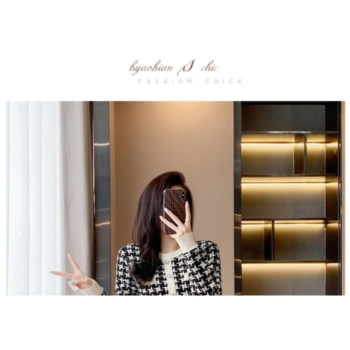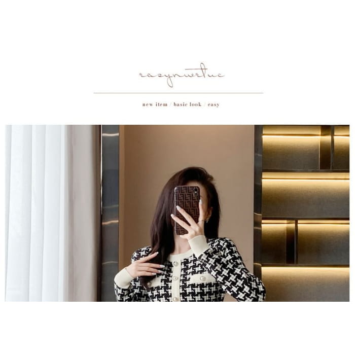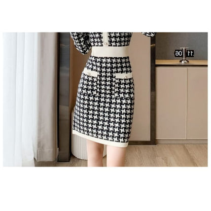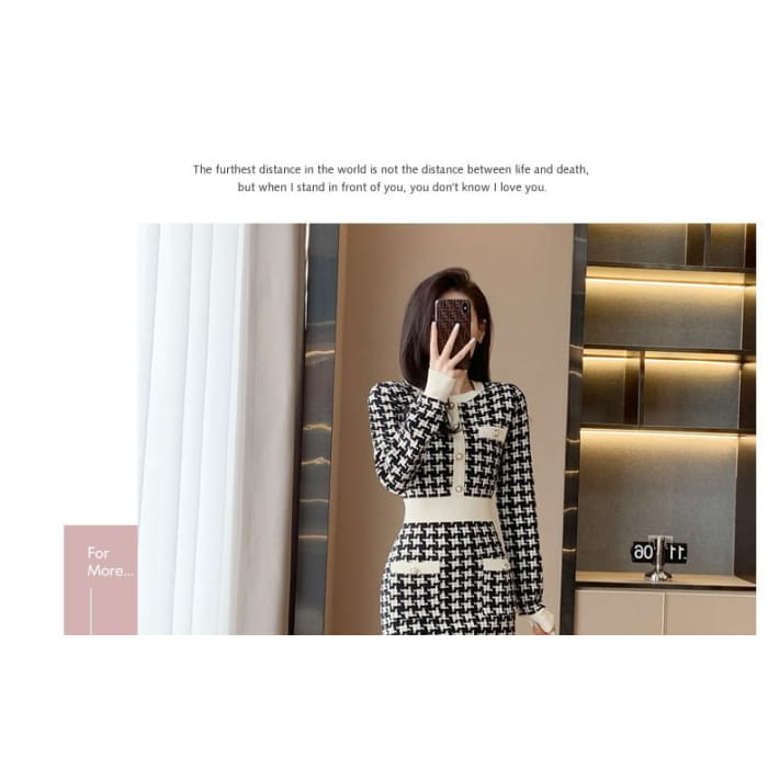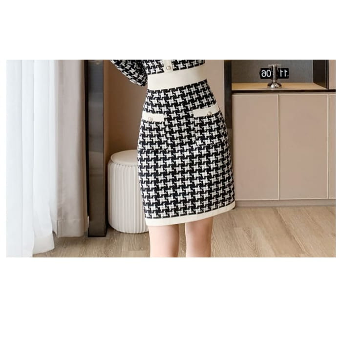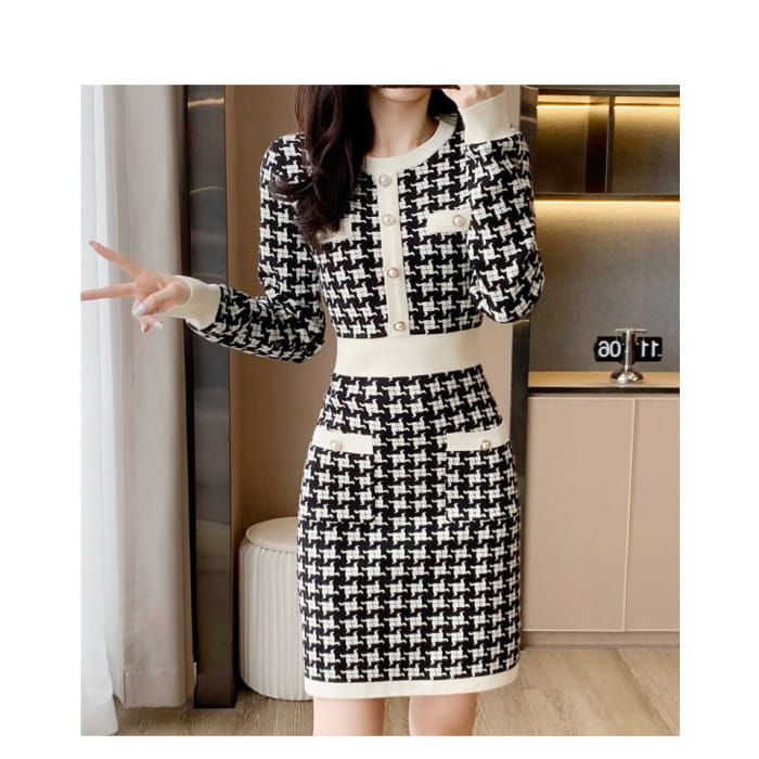 Langärmliges Mini-Etuikleid aus gemustertem Strick mit Rundhalsausschnitt
