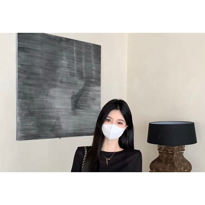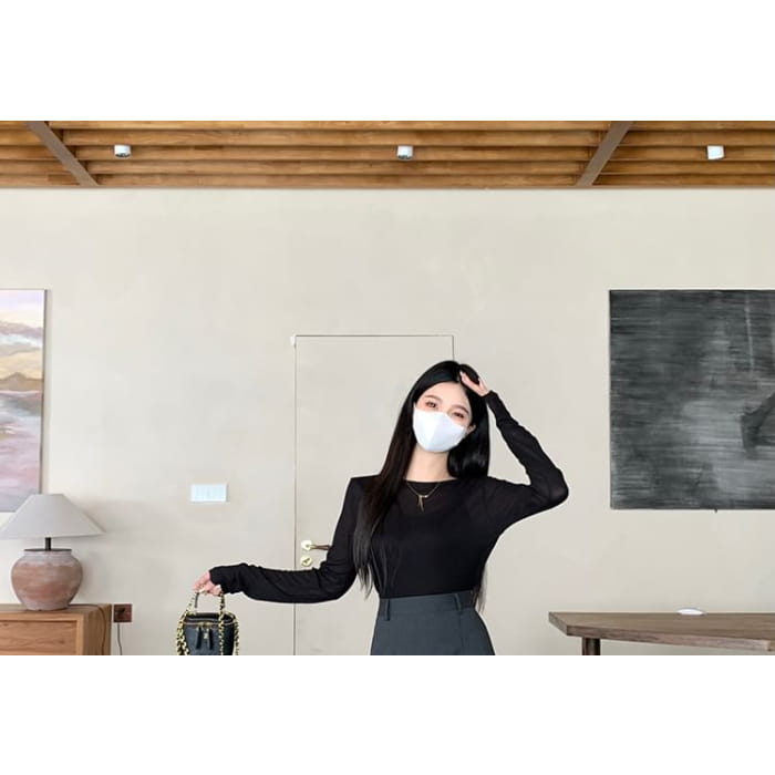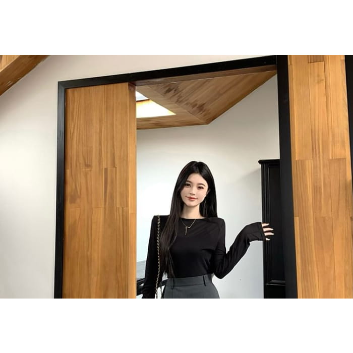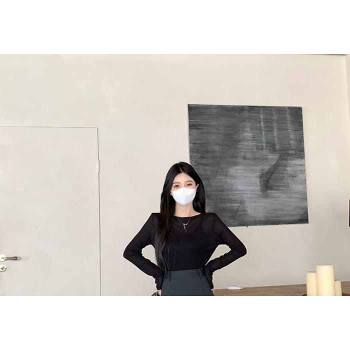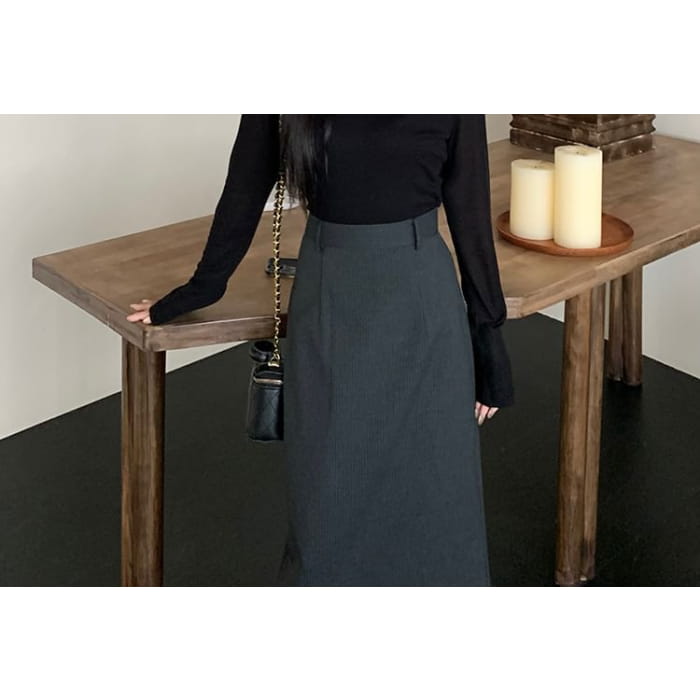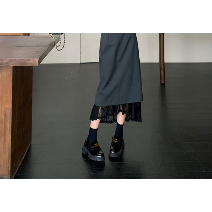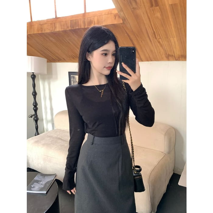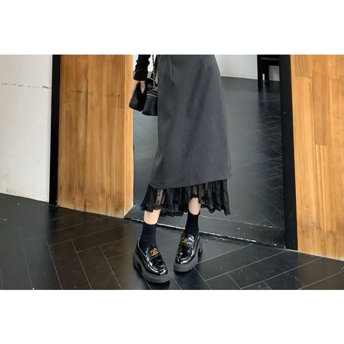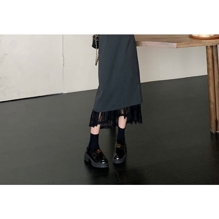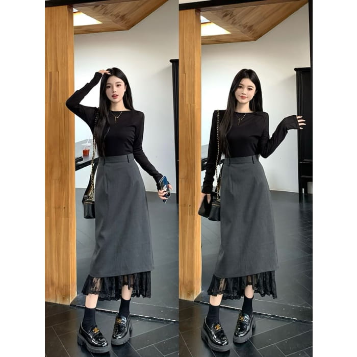 Long-Sleeve Crew Neck Plain Knit Top / High Rise Lace Trim Midi A-Line Skirt