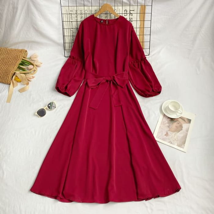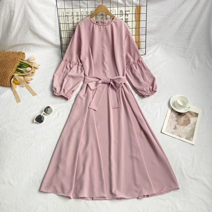 Langärmliges, schlichtes Midikleid in A-Linie mit Rundhalsausschnitt und Schärpen
