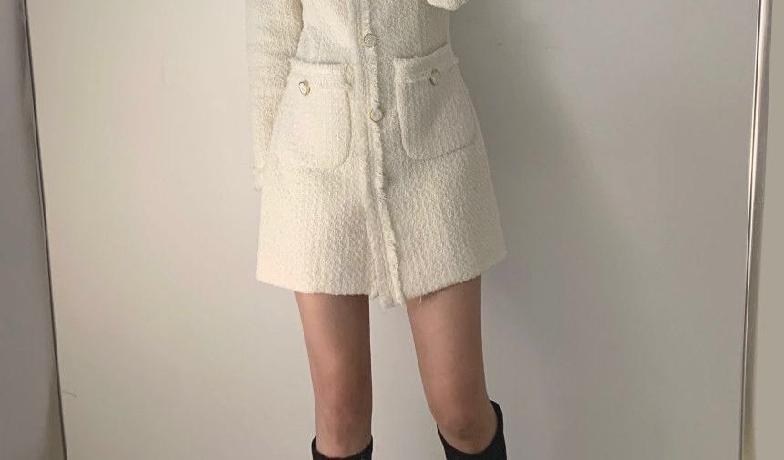 Long-Sleeve Fray Hem Mini A-Line Tweed Dress