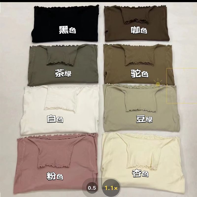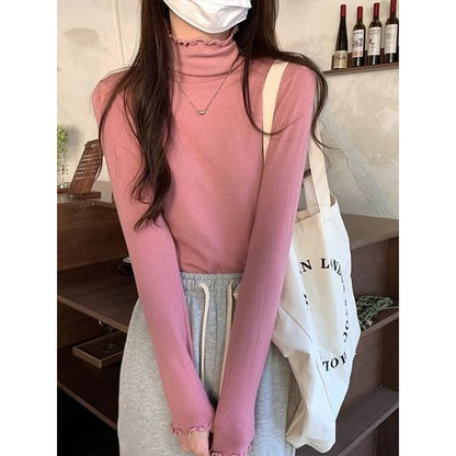 Long-Sleeve High Neck Plain Lettuce Edge Knit Top