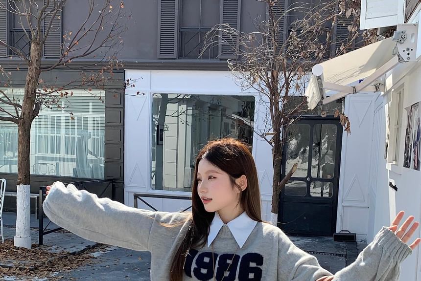 Long-Sleeve Plain Shirt / Crew Neck Number Print Cropped Sweater / High Rise Plain Pleated Mini A-Line Skirt