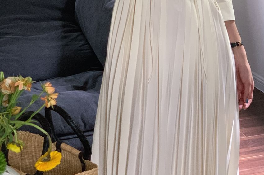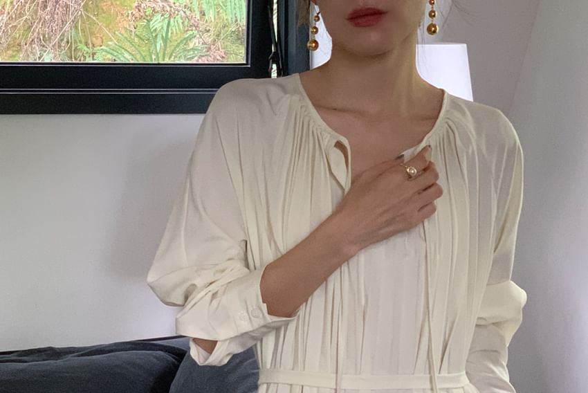 Long Sleeve Round Neck Plain Accordion Pleated Tie Front Maxi A-Line Dress