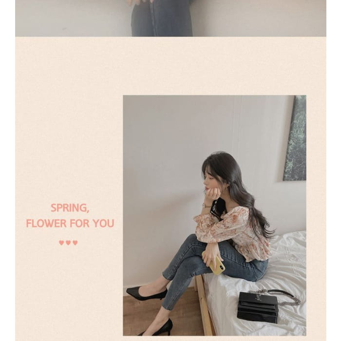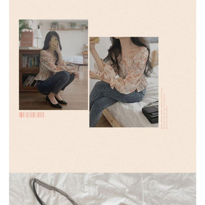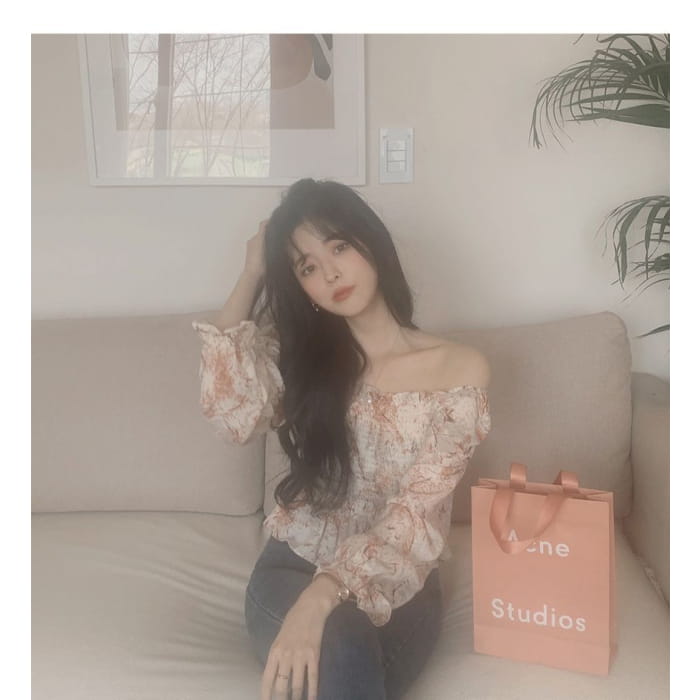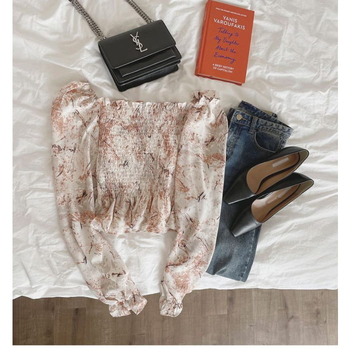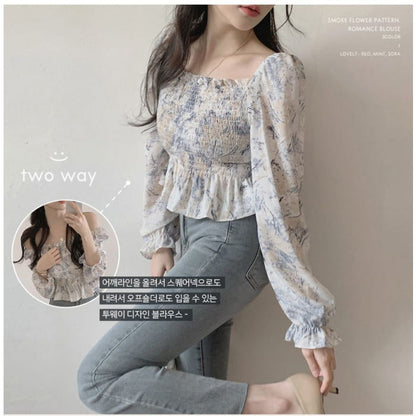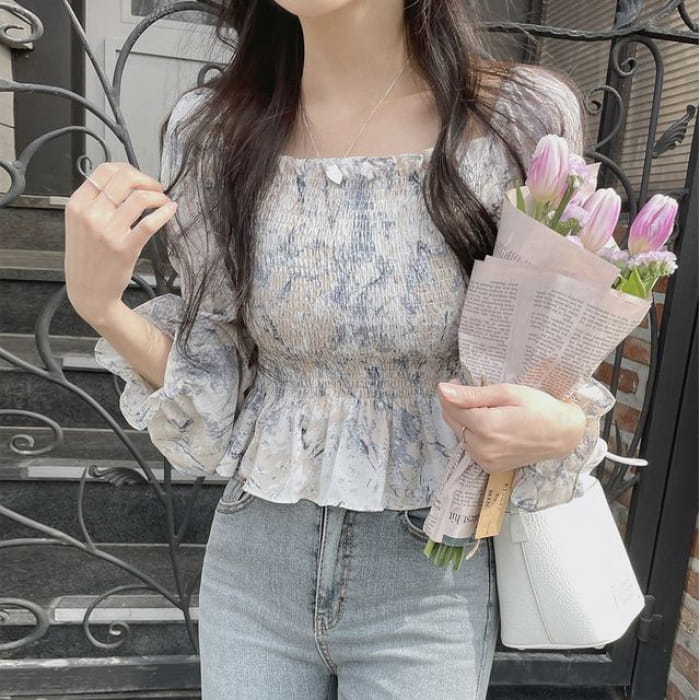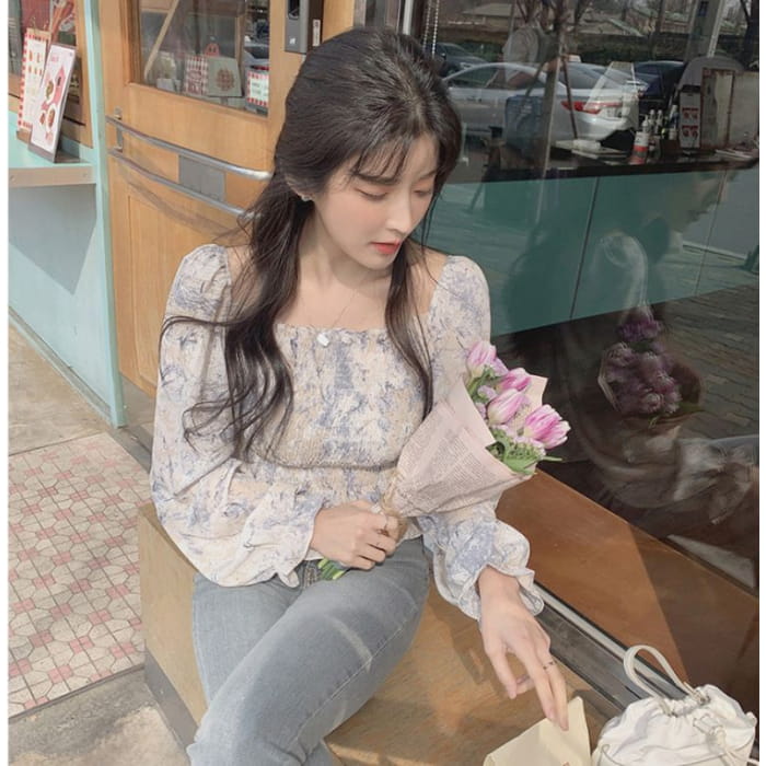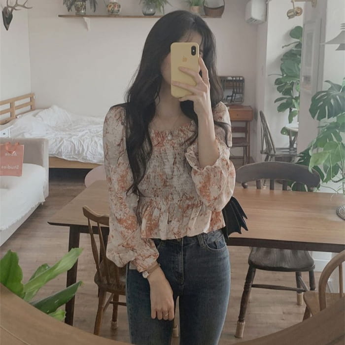 Kurztop mit langen Ärmeln, quadratischem Ausschnitt, gesmoktem Blumenmuster