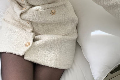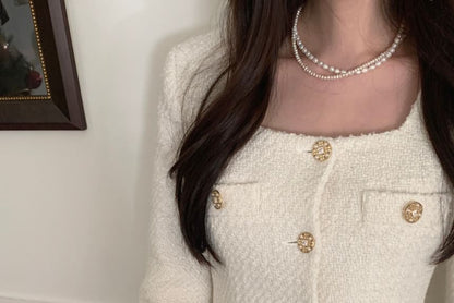 Long-Sleeve Square Neck Plain Button Tweed Mini A-Line Dress