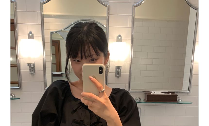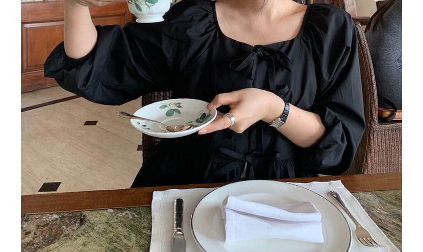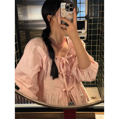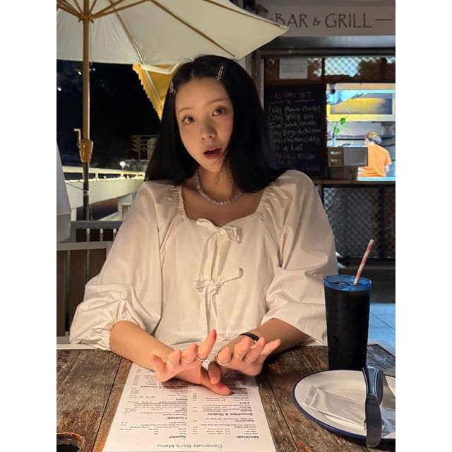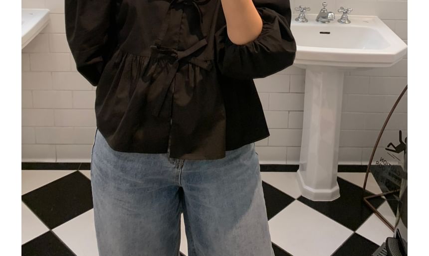 Long Sleeve Square Neck Plain Peplum Tie Front Blouse