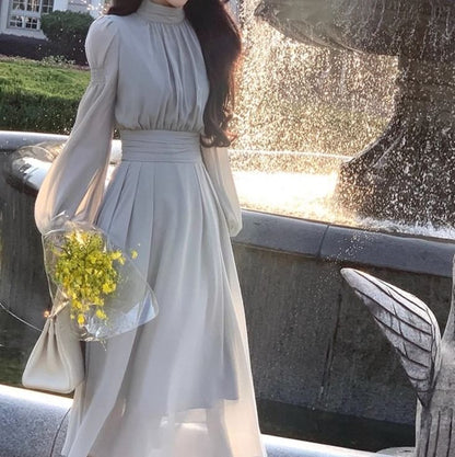 Long-Sleeve Stand Collar Plain Midi A-Line Dress