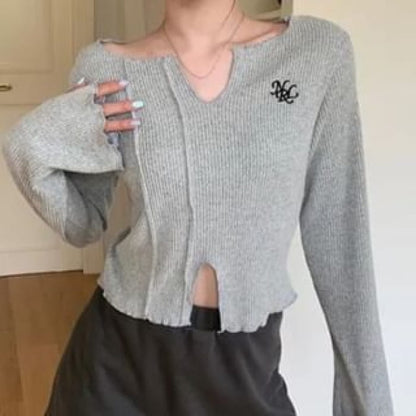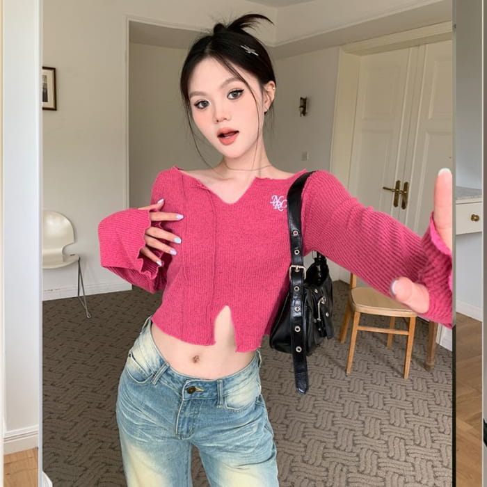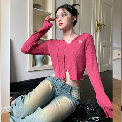 Langärmliges, besticktes Crop-Stricktop mit V-Ausschnitt