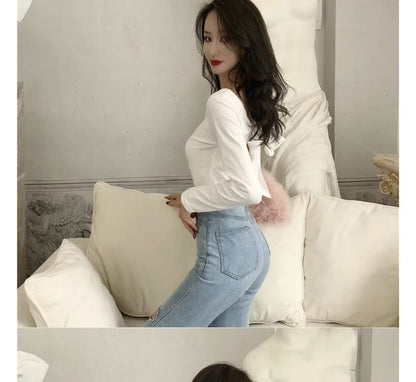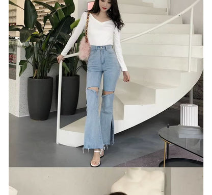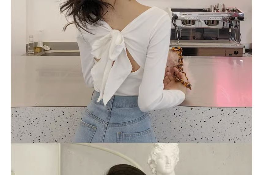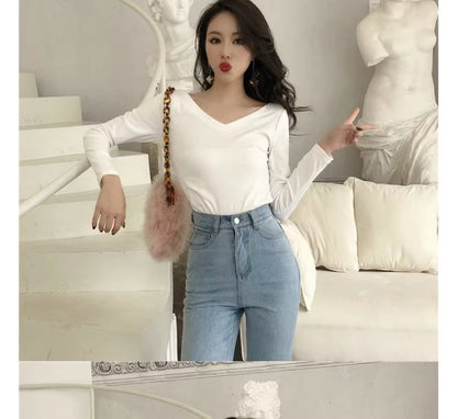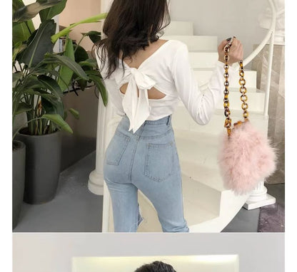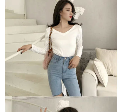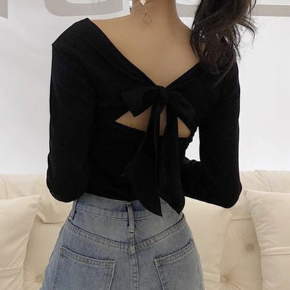 Long-Sleeve V-Neck Plain Bow Back T-Shirt