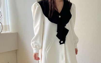 Long-Sleeve V-Neck Two Tone Ruffle Trim Faux Pearl Button Mini Dress