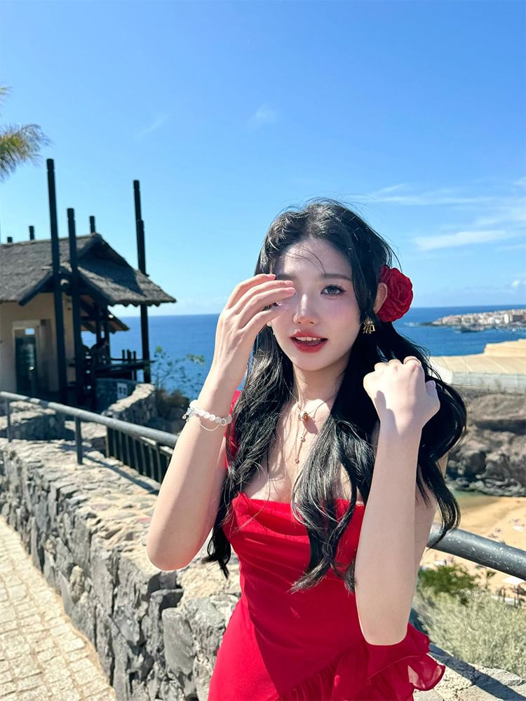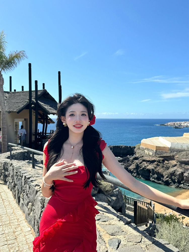 Sleeveless Square Neck Plain Ruffle Trim Open Back Slit Maxi Bodycon Dress