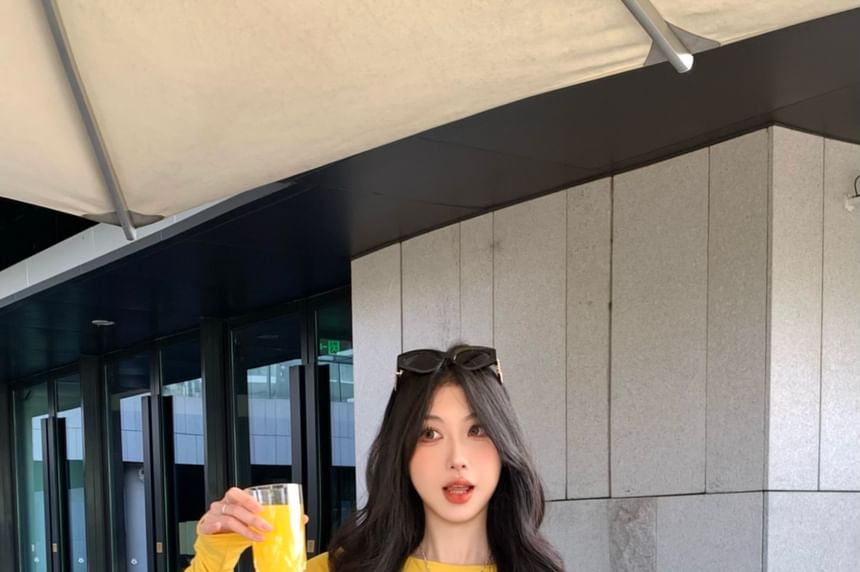 Set: Long-Sleeve Plain Crop T-Shirt + Mini Skirt