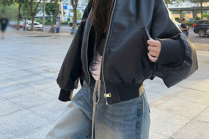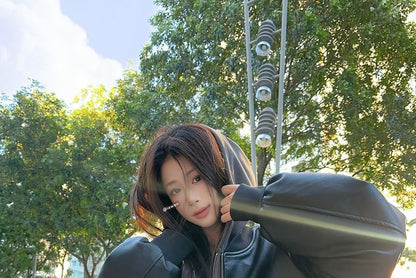 Plain Zip-Up Hoodie / Faux Leather Bomber Jacket