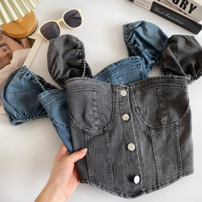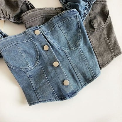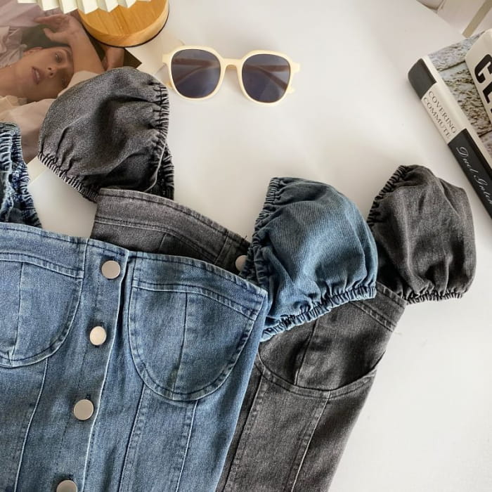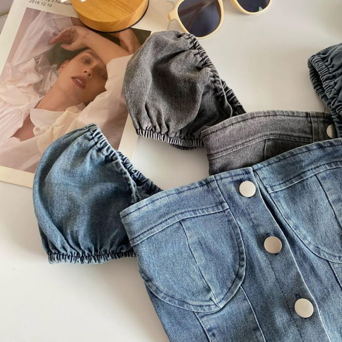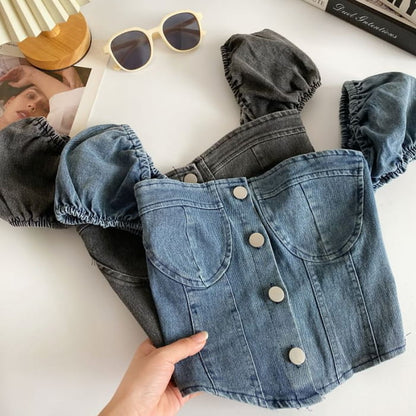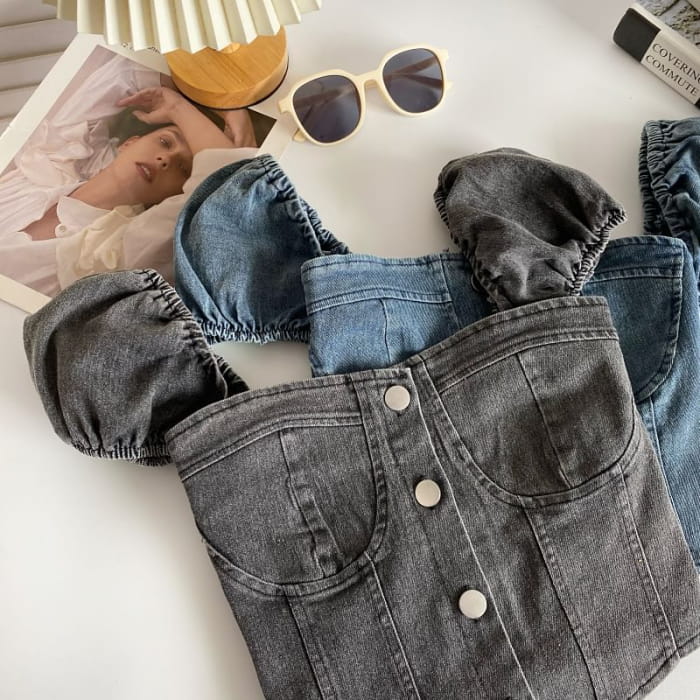 Crop Top aus gewaschenem Denim mit Puffärmeln und Knopfleiste