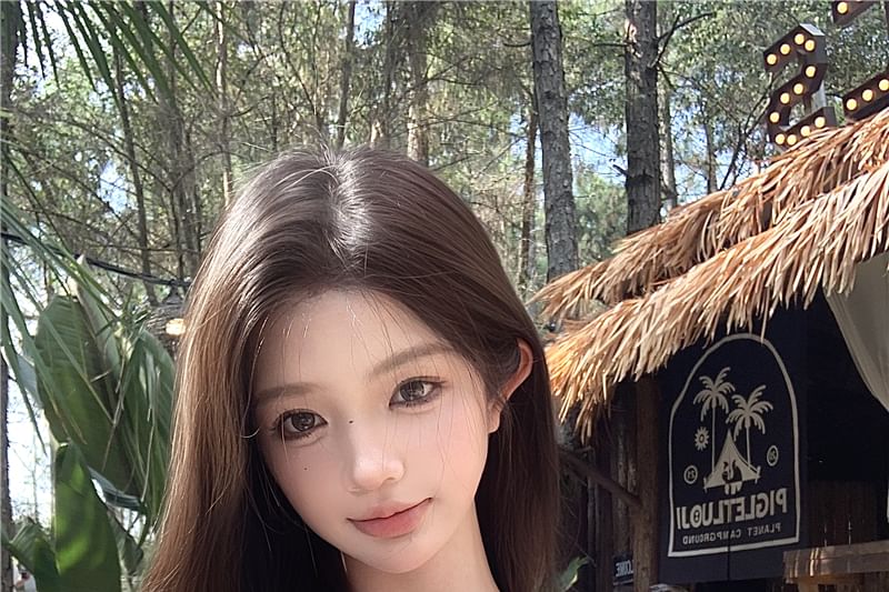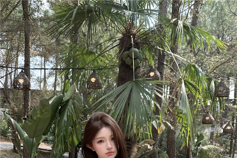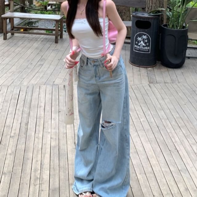Plain Bow Accent Lace Trim Ruched Crop Tube Top / Mid Rise Washed Ripped Wide Leg Jeans