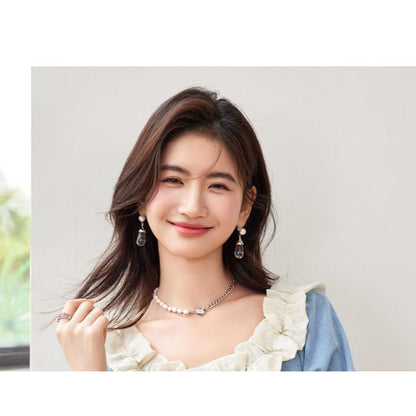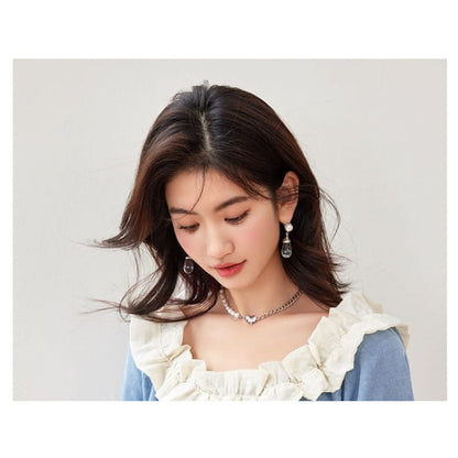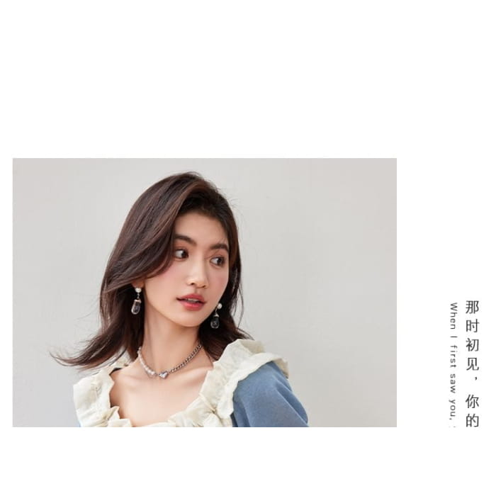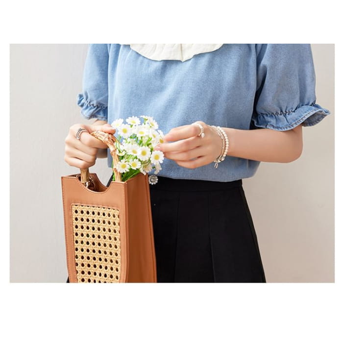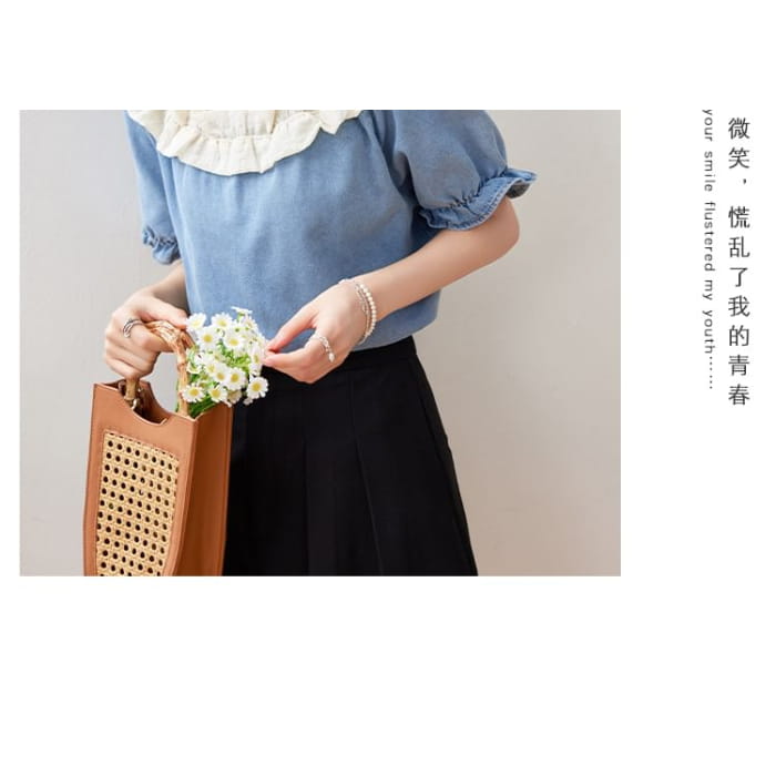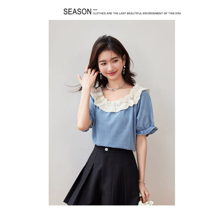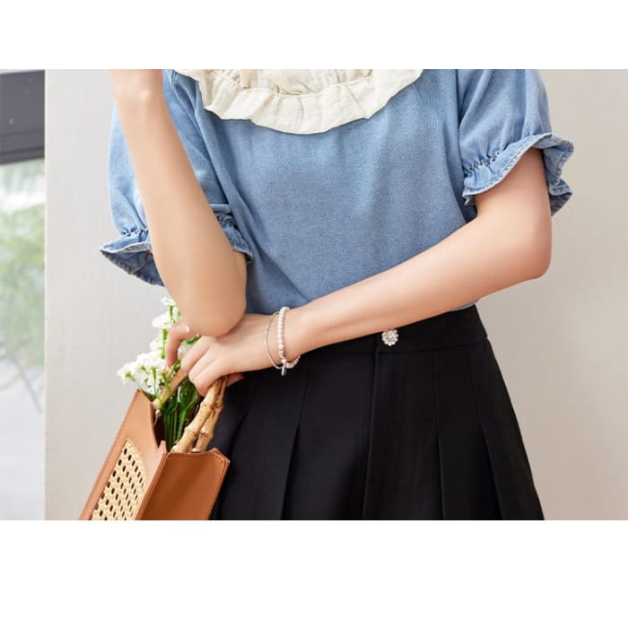Kurzärmliges Jeanstop mit U-Ausschnitt und Rüschen