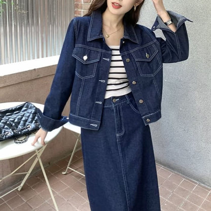 Set: Collared Plain Denim Button Jacket + Mid Rise Denim Midi A-Line Skirt
