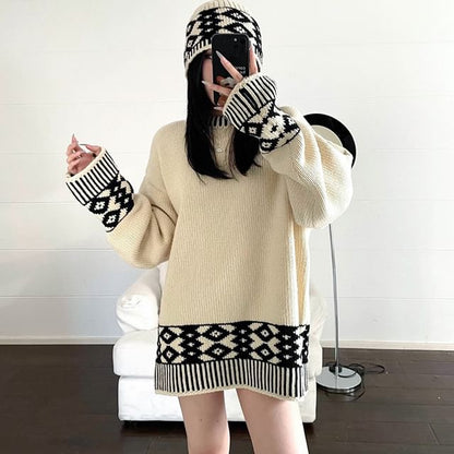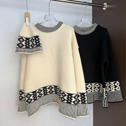 Set: Crew Neck Two Tone Jacquard Oversized Sweater + Beanie