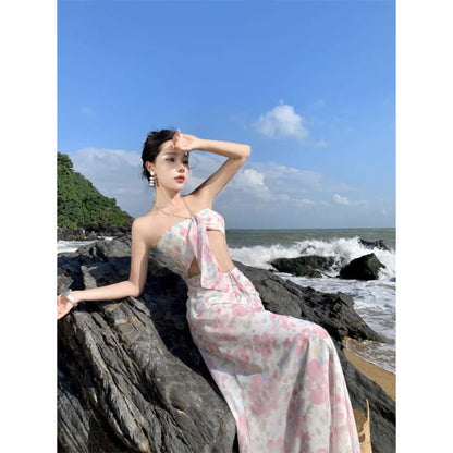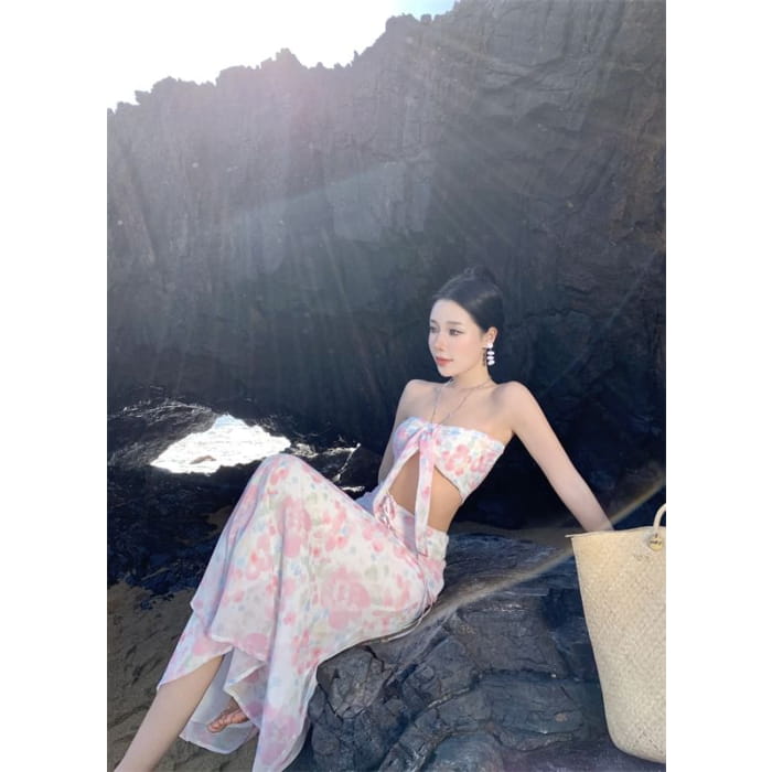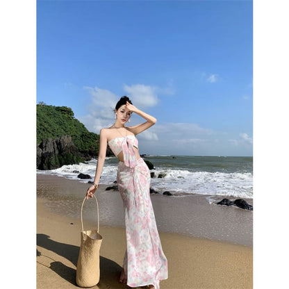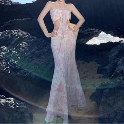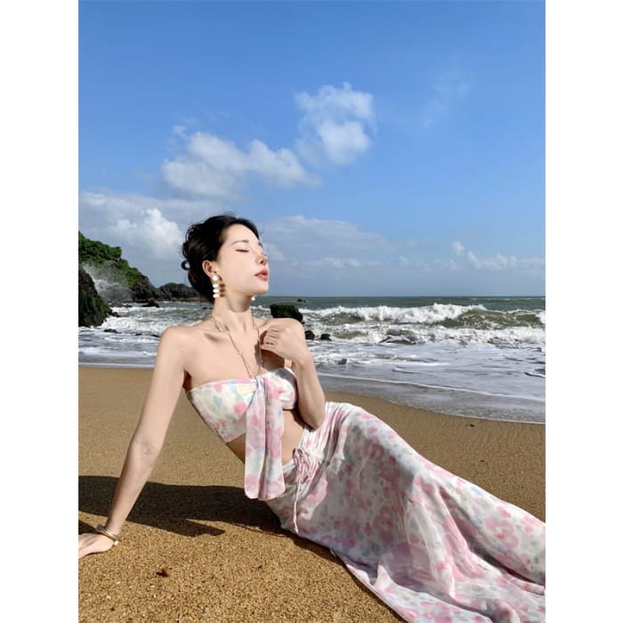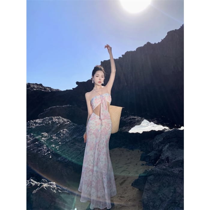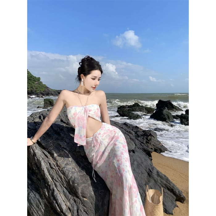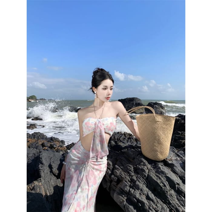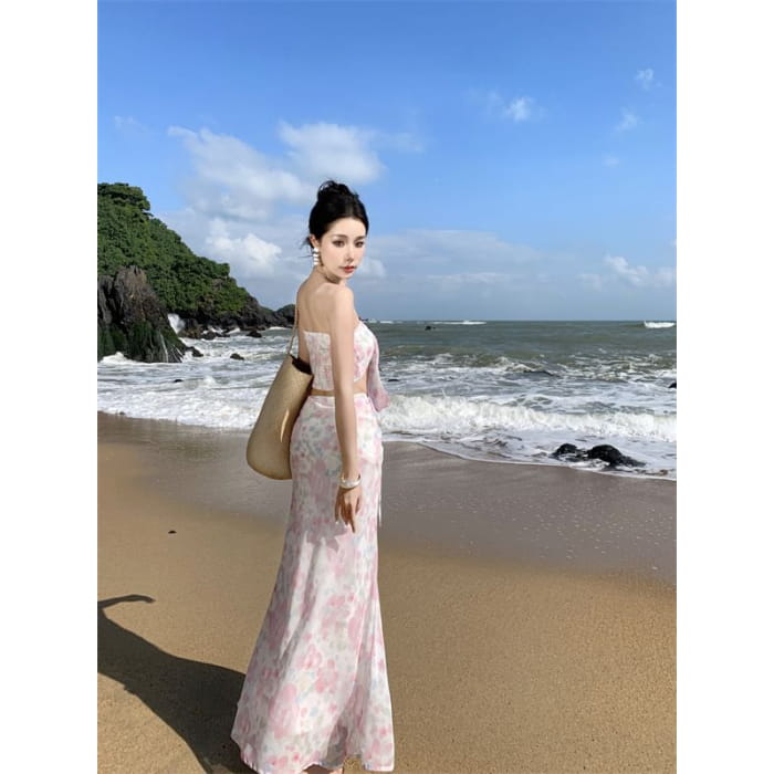 Set: Neckholder-Crop-Top mit Blumenmuster und Smokarbeit + Maxi-Meerjungfrauenrock mit hoher Taille