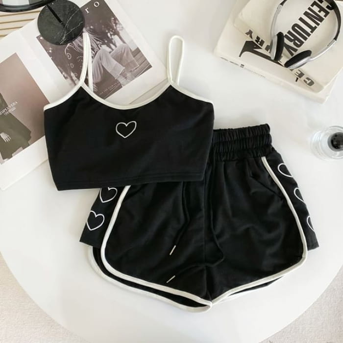 Set: Kurzes Camisole-Oberteil mit Herzstickerei und Kontrastbesatz + Sweatshorts mit Kordelzug in der Taille