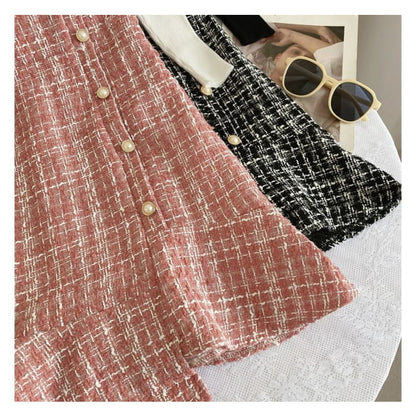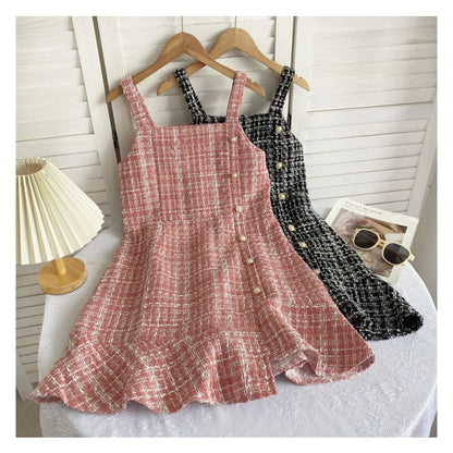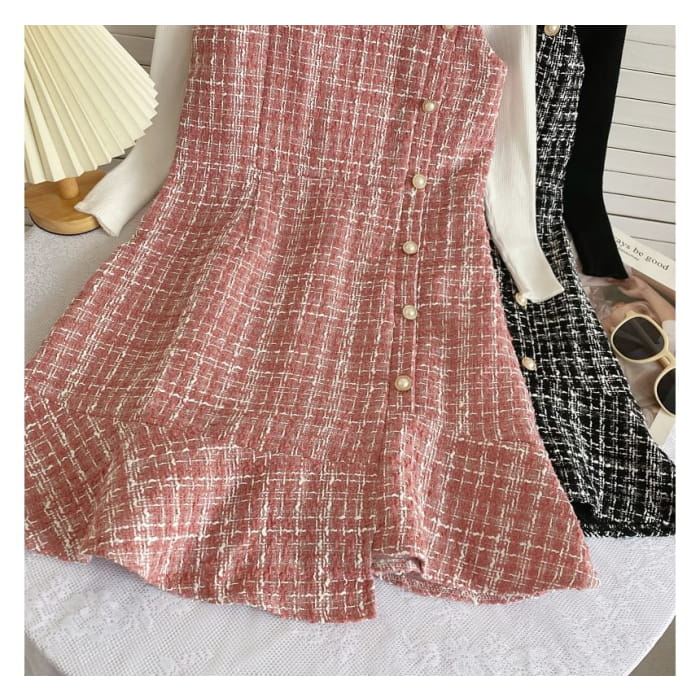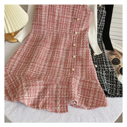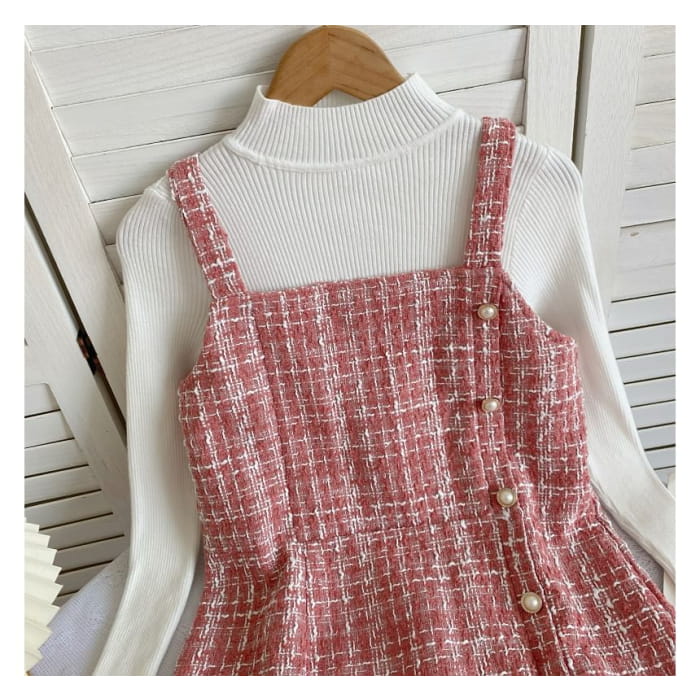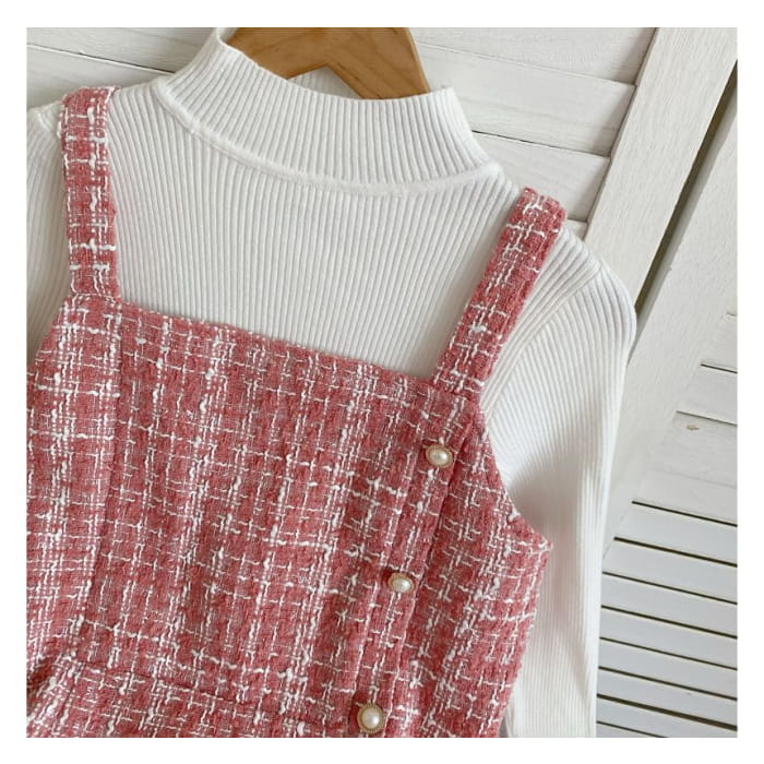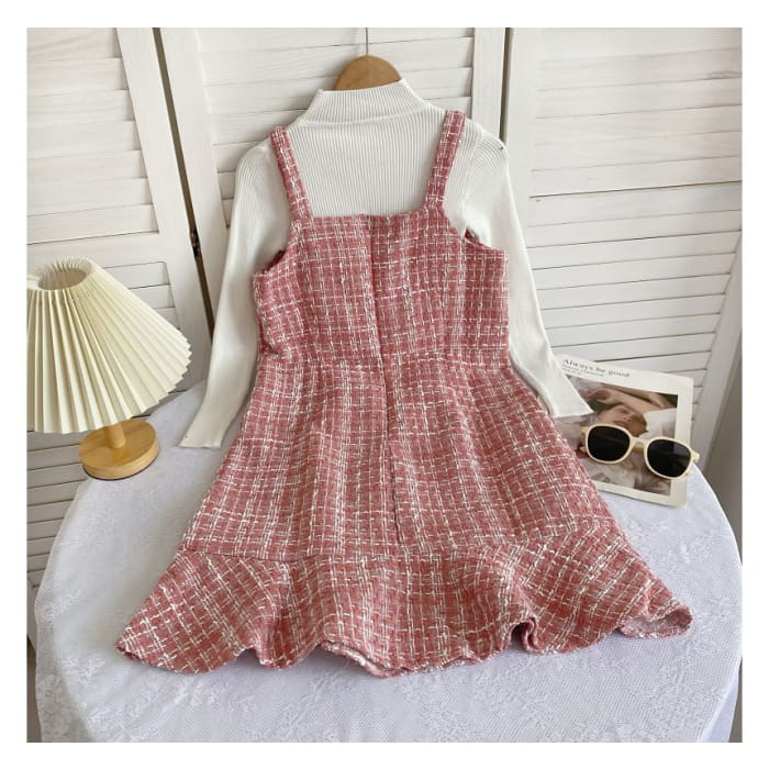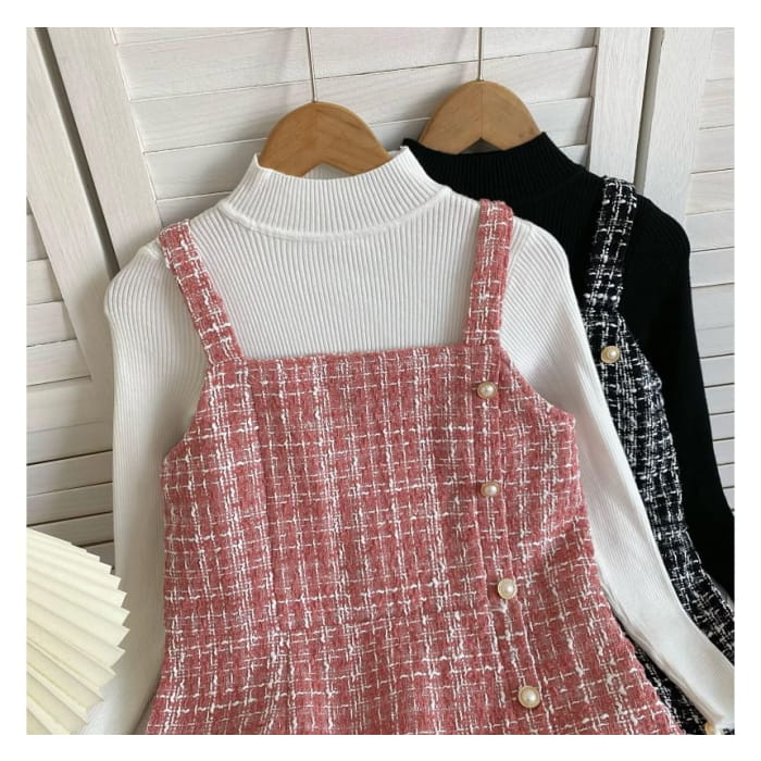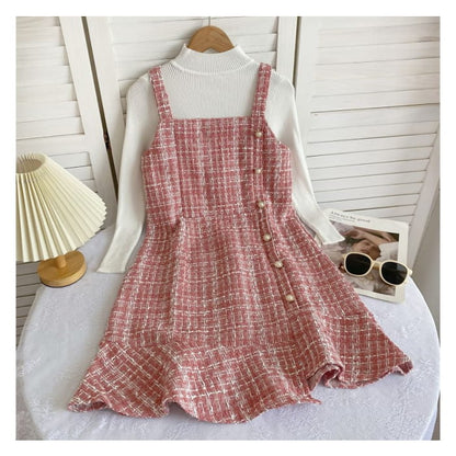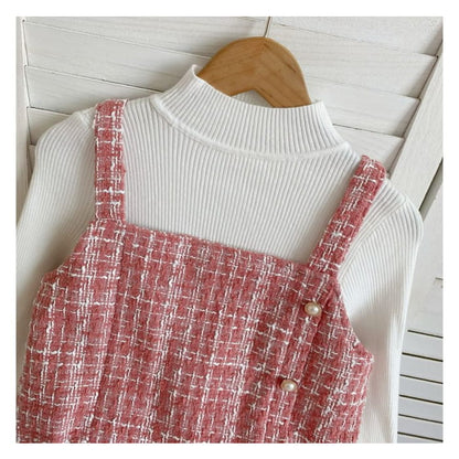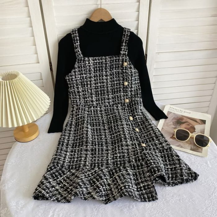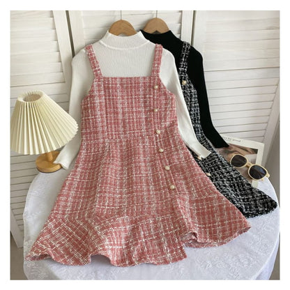 Set: Langärmliges, hochgeschlossenes, schlichtes Rippstrick-Top + kariertes Mini-Latzkleid aus Tweed