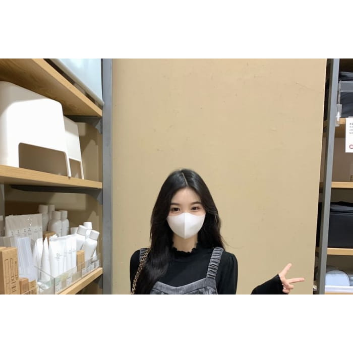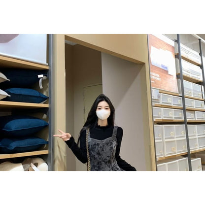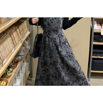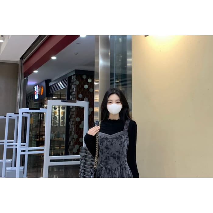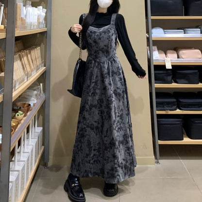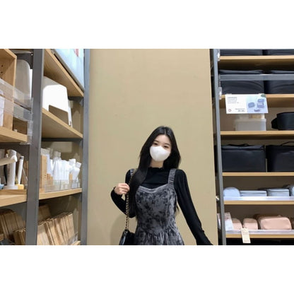 Set: Langärmliges T-Shirt mit Rollkragen und Rüschenbesatz + Maxi-Latzkleid mit Blumenmuster