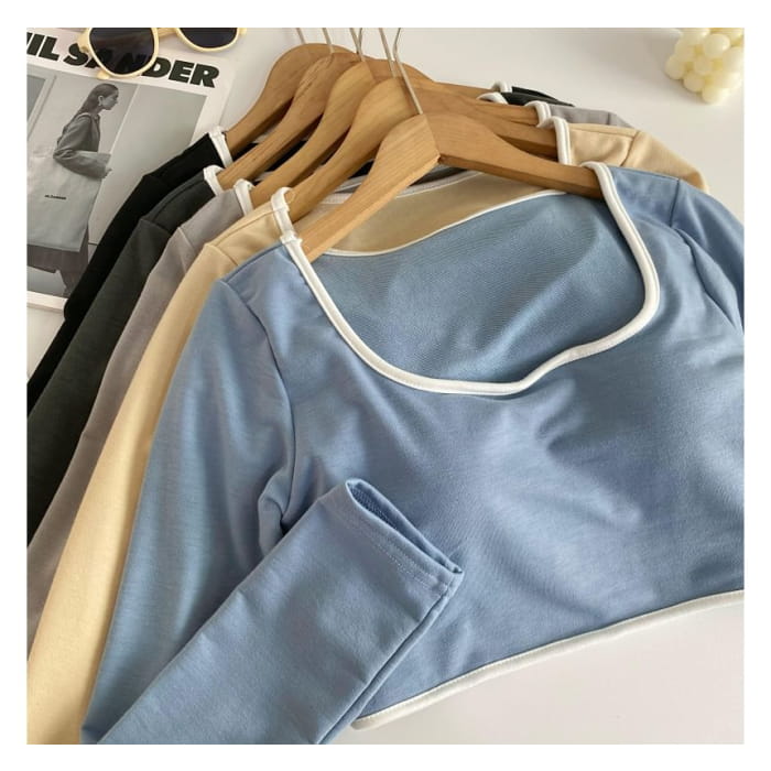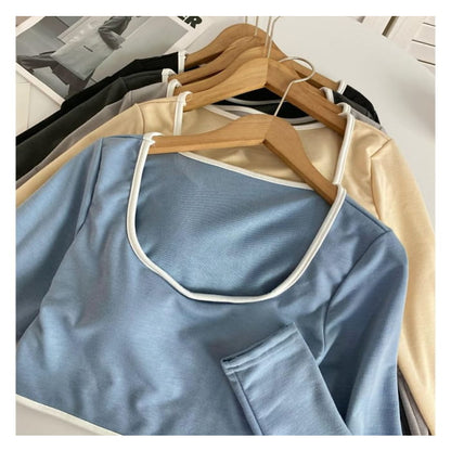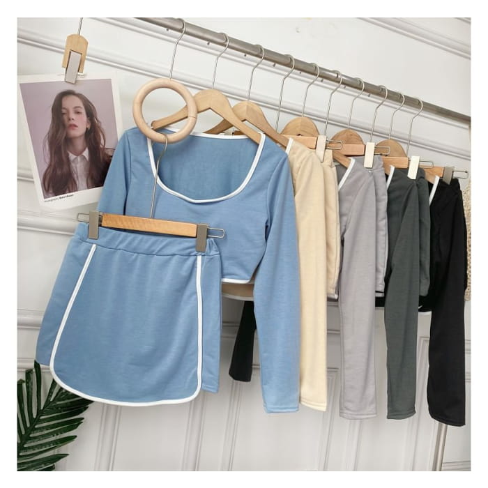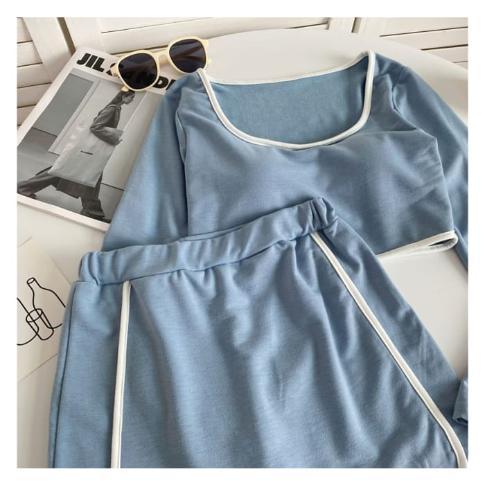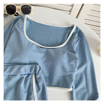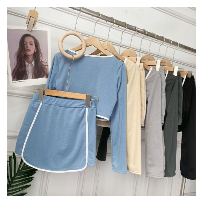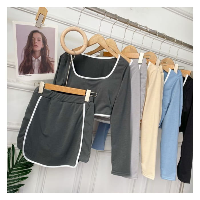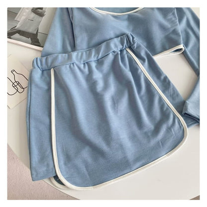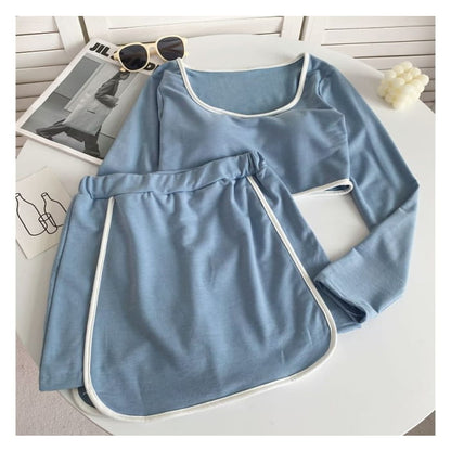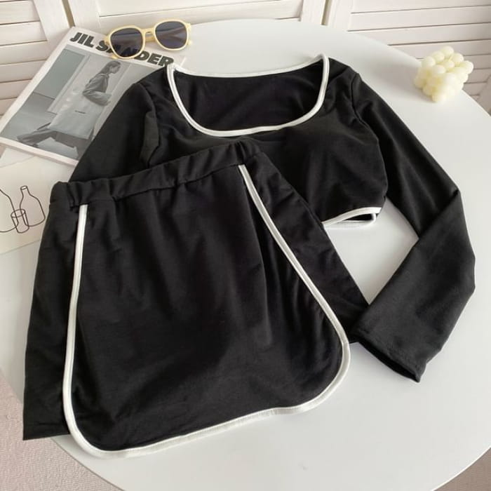 Set: Langärmliges, kurzes T-Shirt mit Rundhalsausschnitt und Kontrastbesatz + hoch taillierter Minirock in A-Linie