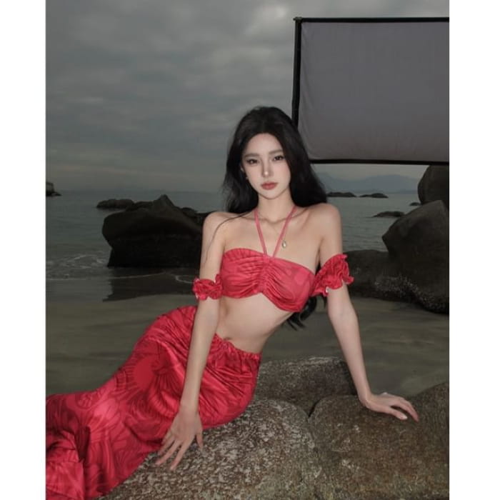Set: Schulterfreies, bedrucktes Crop-Top mit Kordelzug + Low Rise Midi-Bleistiftrock