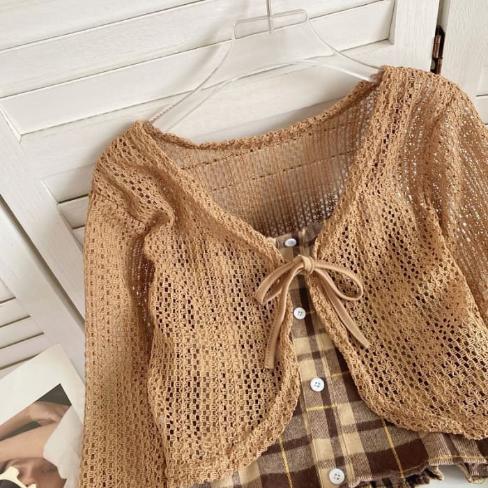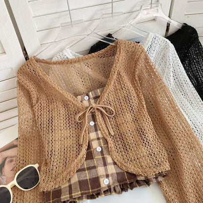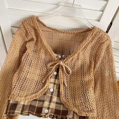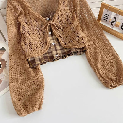 Set: Kariertes, gerüschtes Camisole-Oberteil mit Knöpfen + Cardigan zum Binden vorne