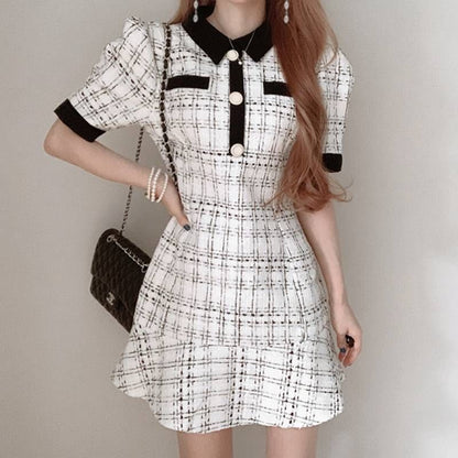 Short-Sleeve Collared Tweed Mini A-Line Dress