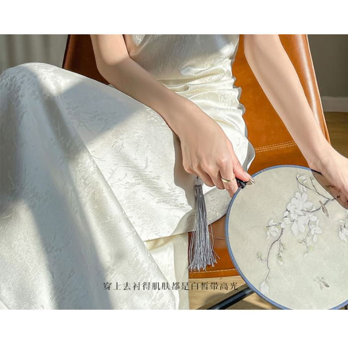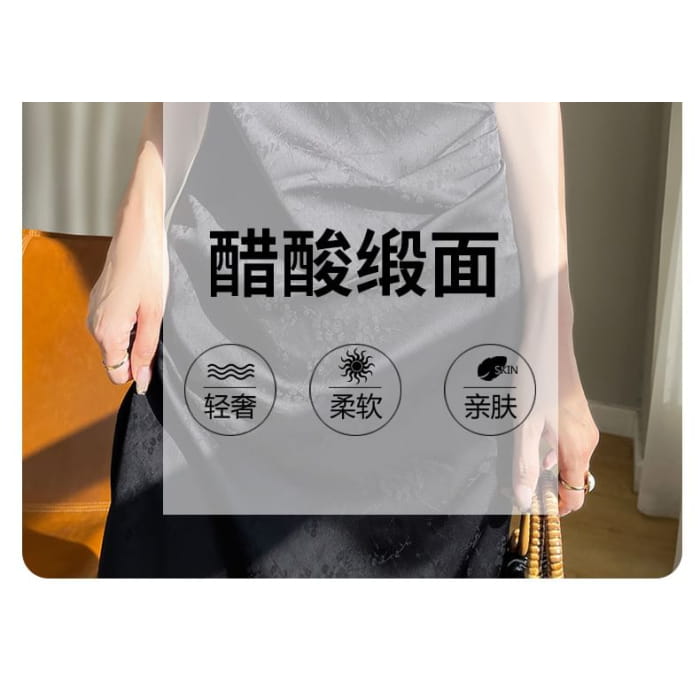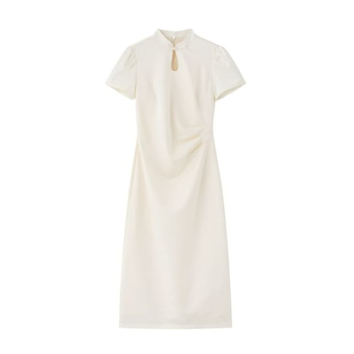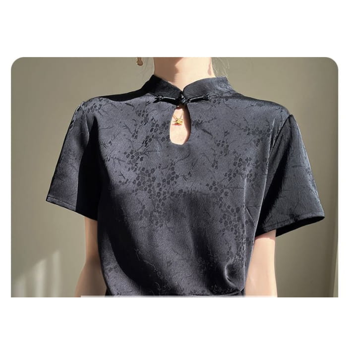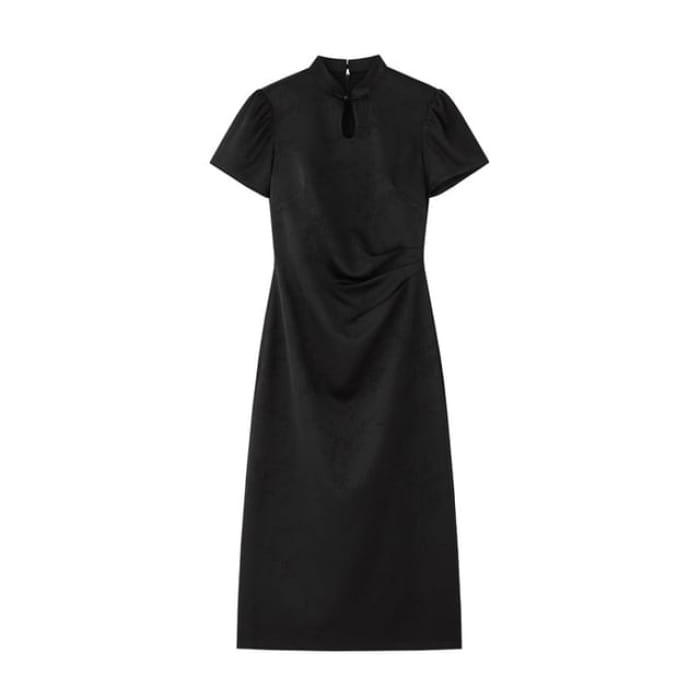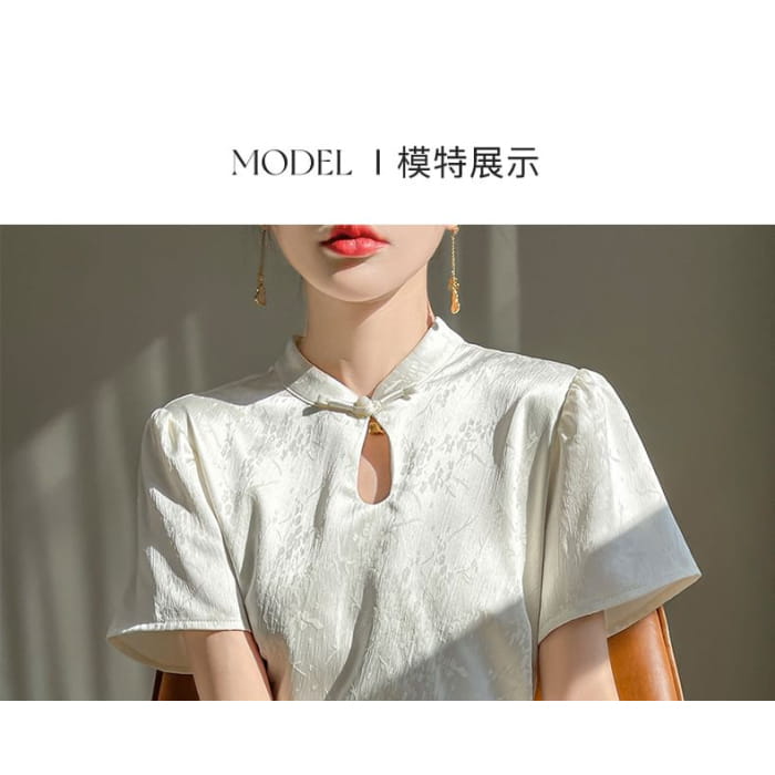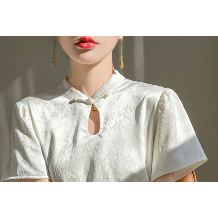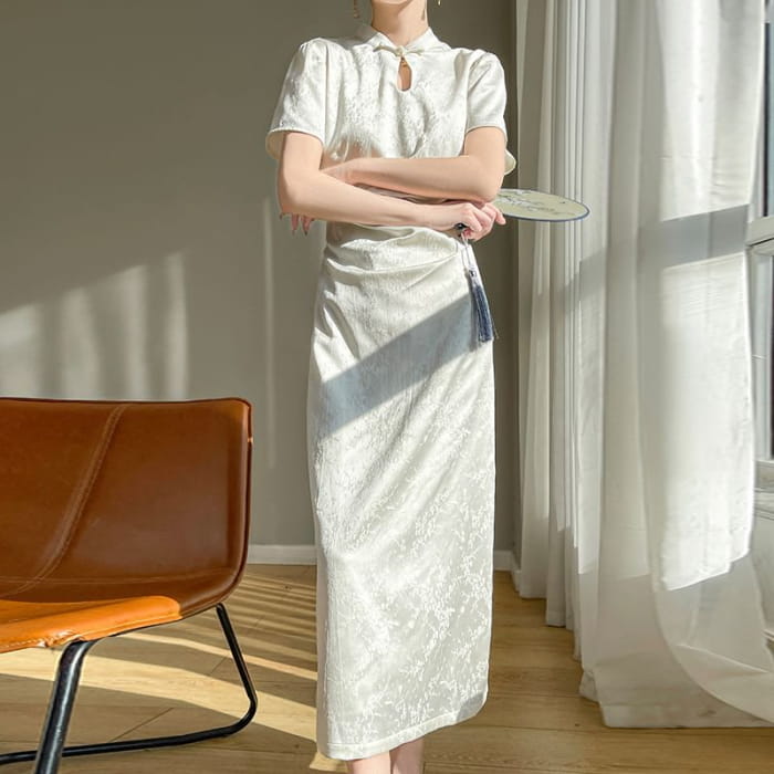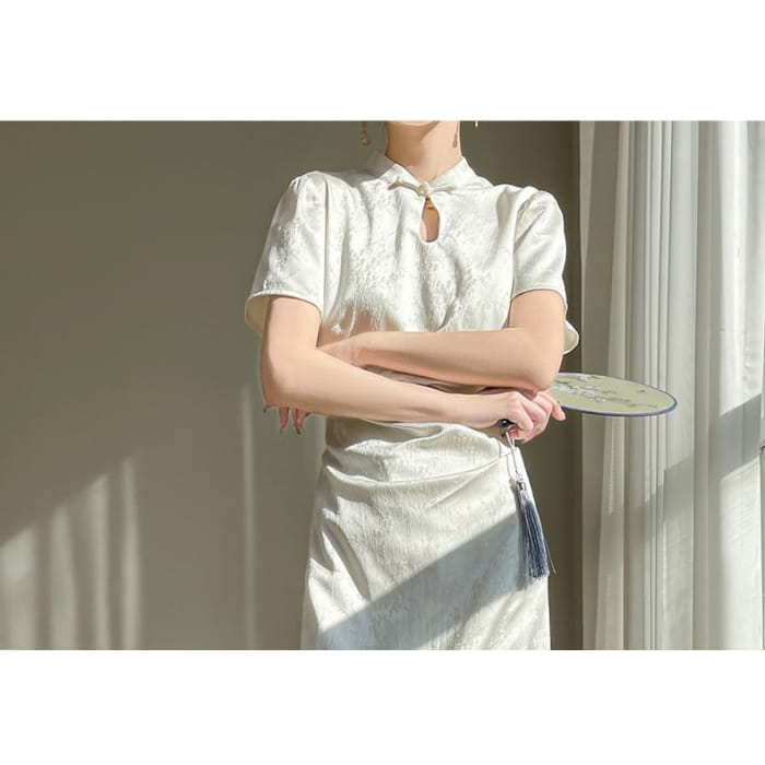 Short-Sleeve Floral Jacquard Keyhole Midi A-Line Dress