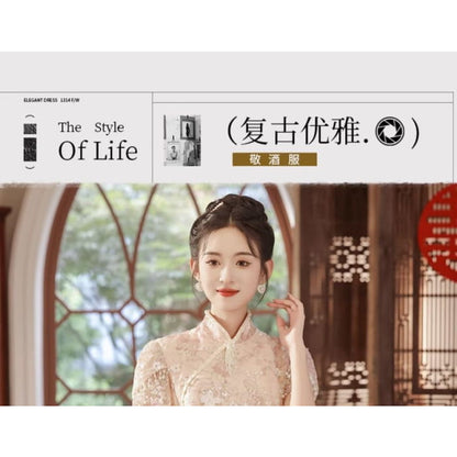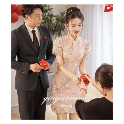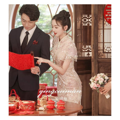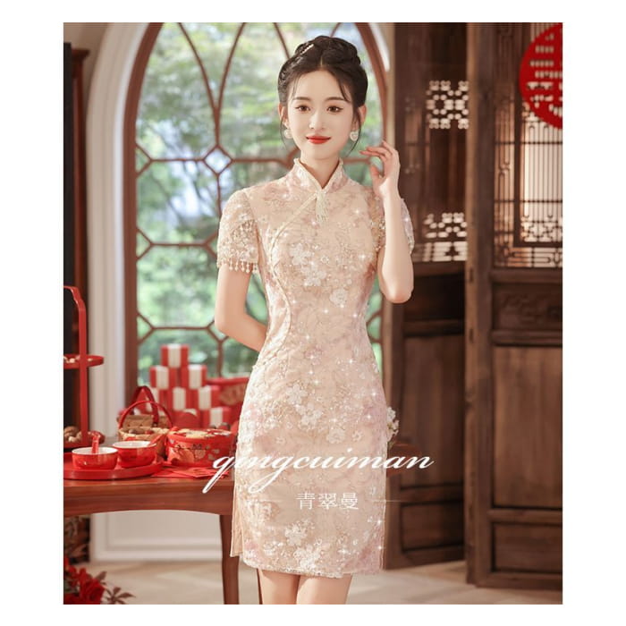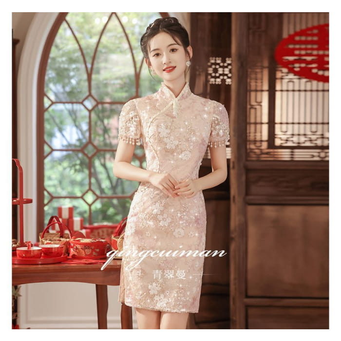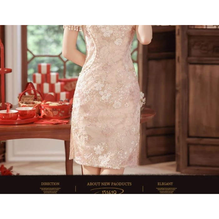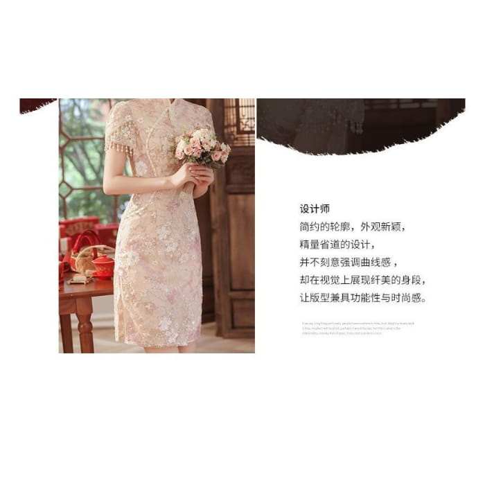 Kurzärmliges, mit Blumenmuster und Fransen verziertes Mini-Etuikleid im Qipao-Stil