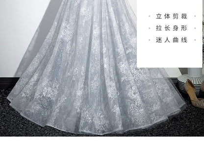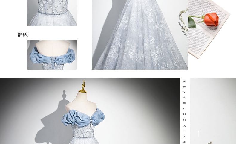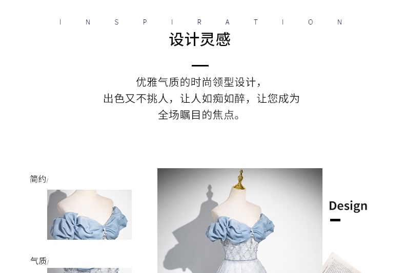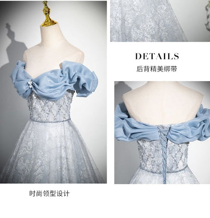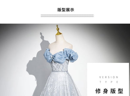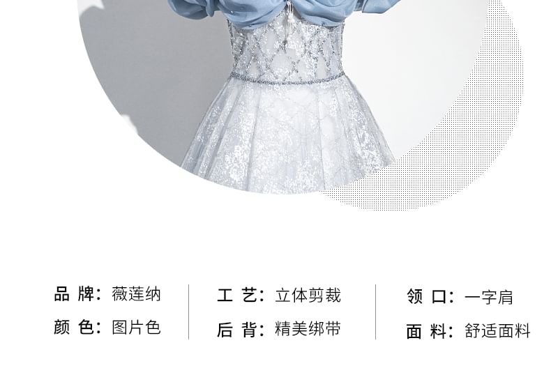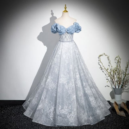 Short-Sleeve Off Shoulder Beaded Ruched Mesh A-Line Evening Gown