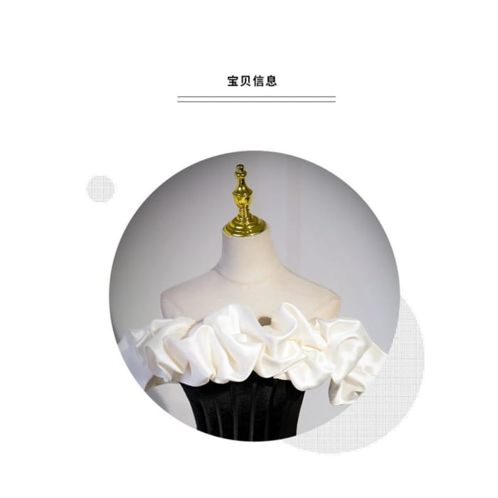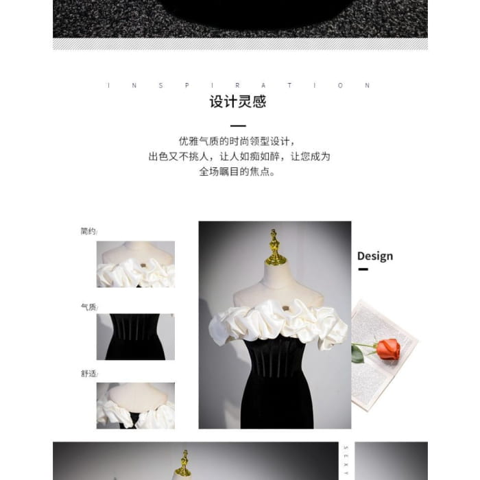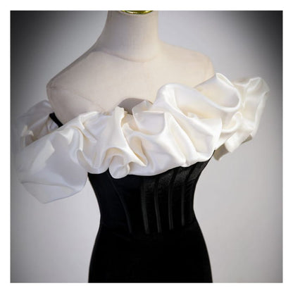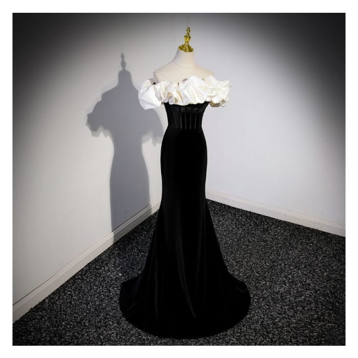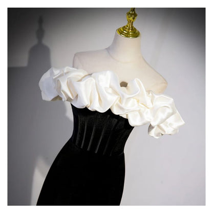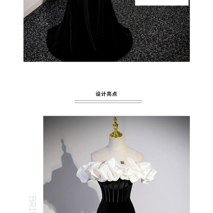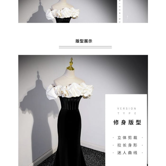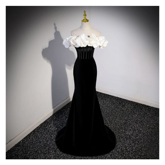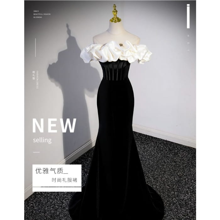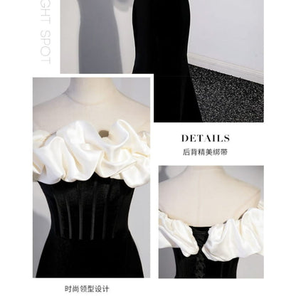 Kurzärmliges, schulterfreies, zweifarbiges Meerjungfrauen-Abendkleid aus Samt mit Rüschen