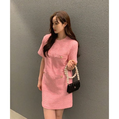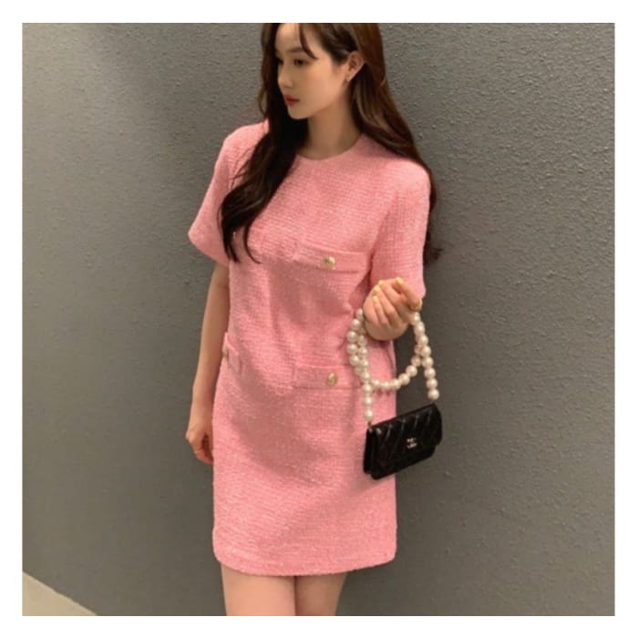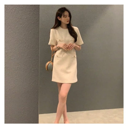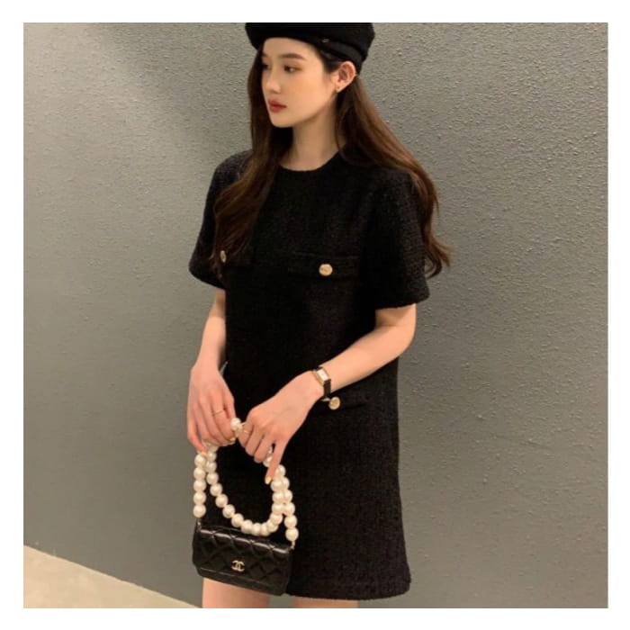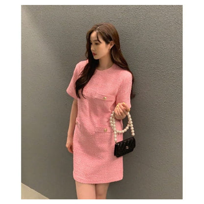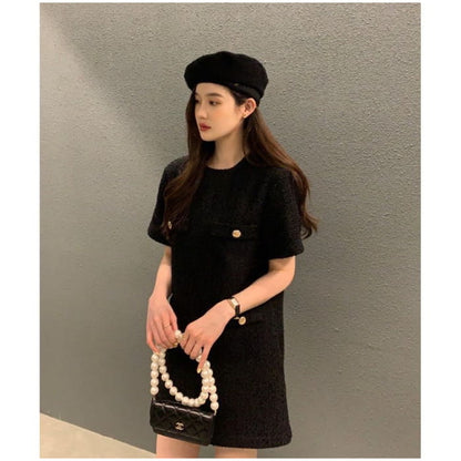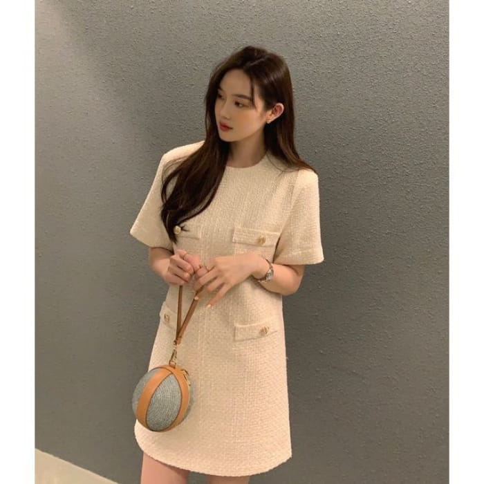 Kurzärmliges, schlichtes Mini-A-Linien-Kleid aus Tweed mit Rundhalsausschnitt