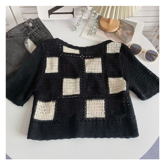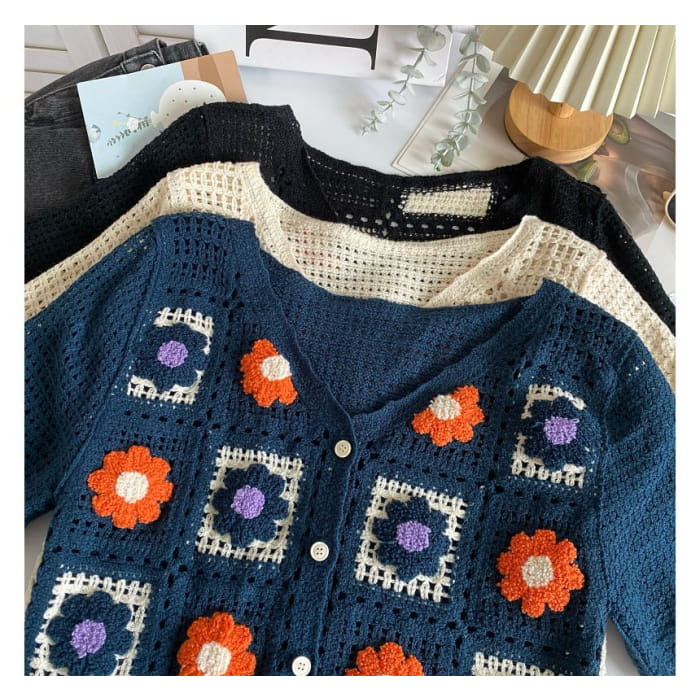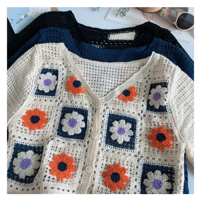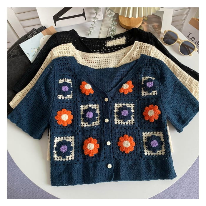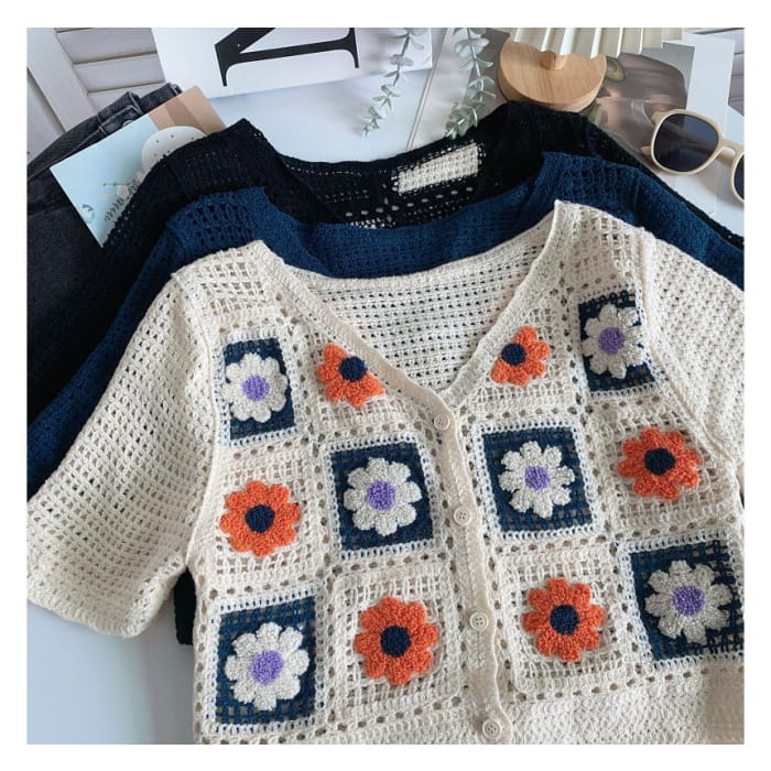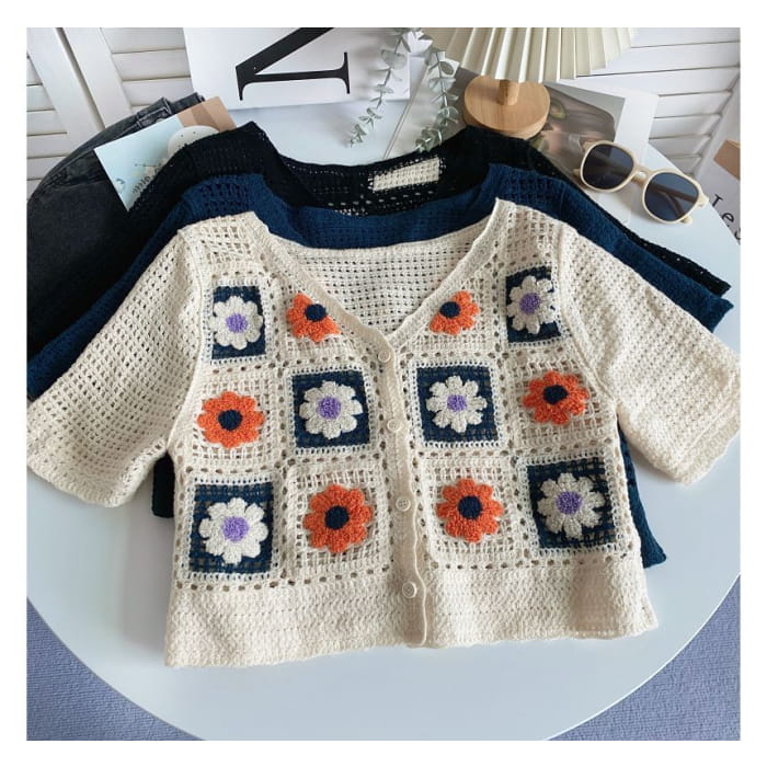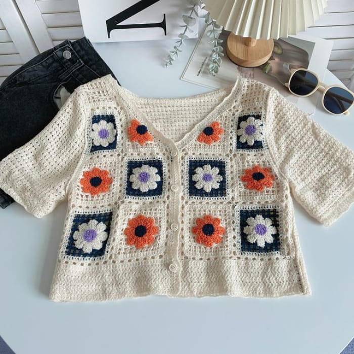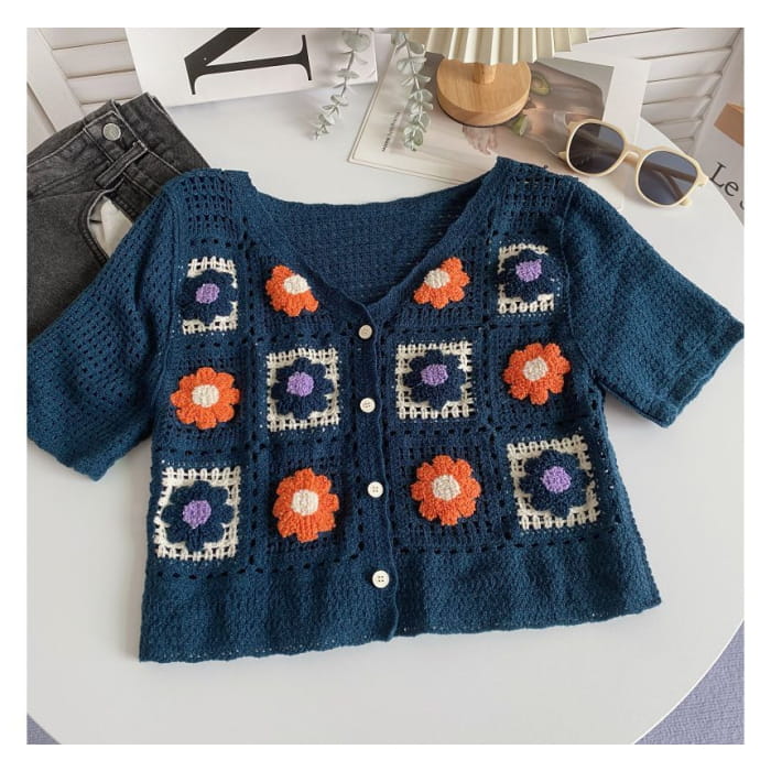 Kurzärmlige Strickjacke mit V-Ausschnitt und Häkelmuster
